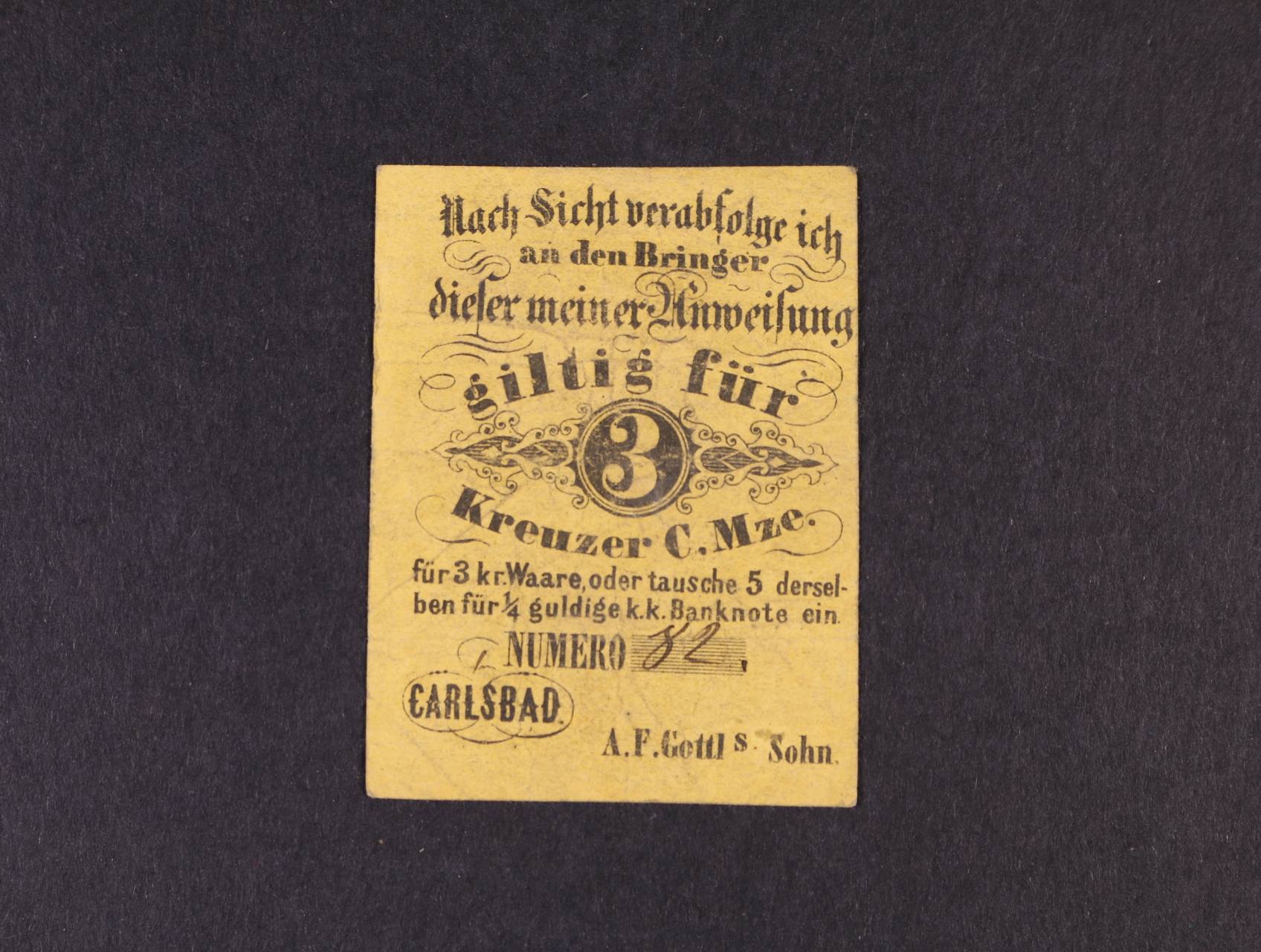 Carlsbad (Karlovy Vary), 3 kr. C.M. b.d. A.F.Gottls Sohn, žlutý, oběhová, V.R. 185.16.03.a.O