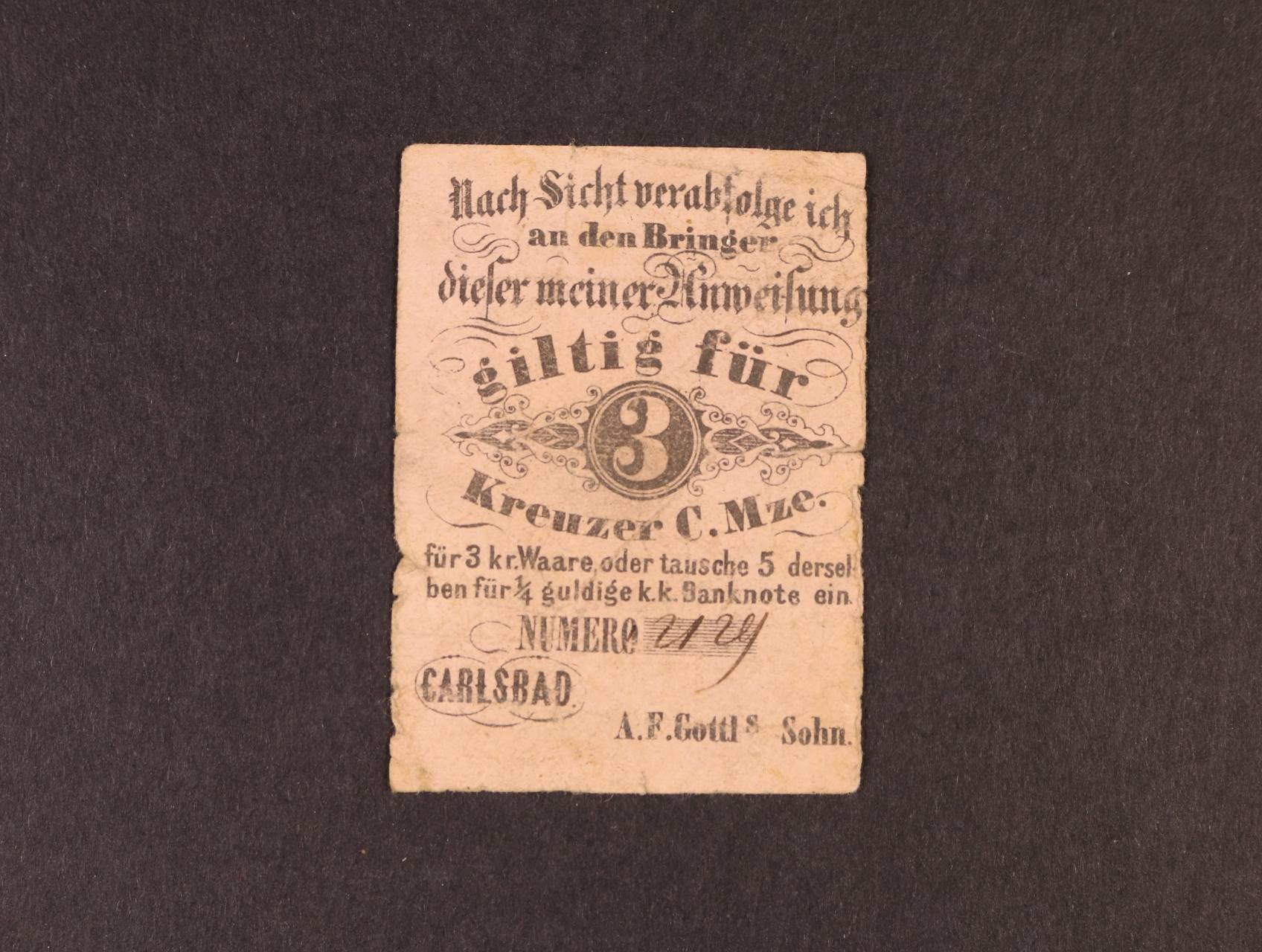 Carlsbad (Karlovy Vary), 3 kr. C.M. b.d. A.F.Gottls Sohn, červený, oběhová, V.R. 185.16.03.c.O
