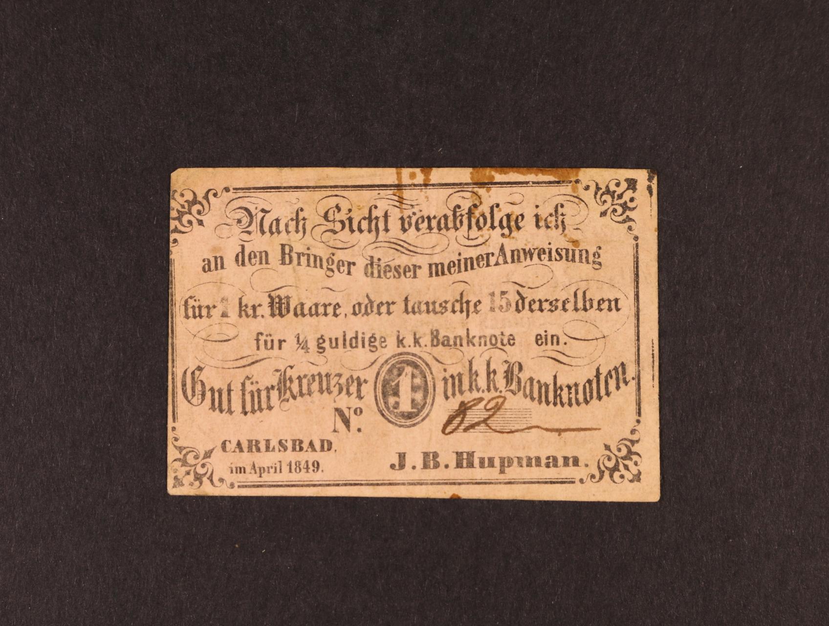 Carlsbad (Karlovy Vary), 1 kr. C.M. IV.1849 J.B.Haupman, růžový, oběhová, V.R. 185.18.01.b.O