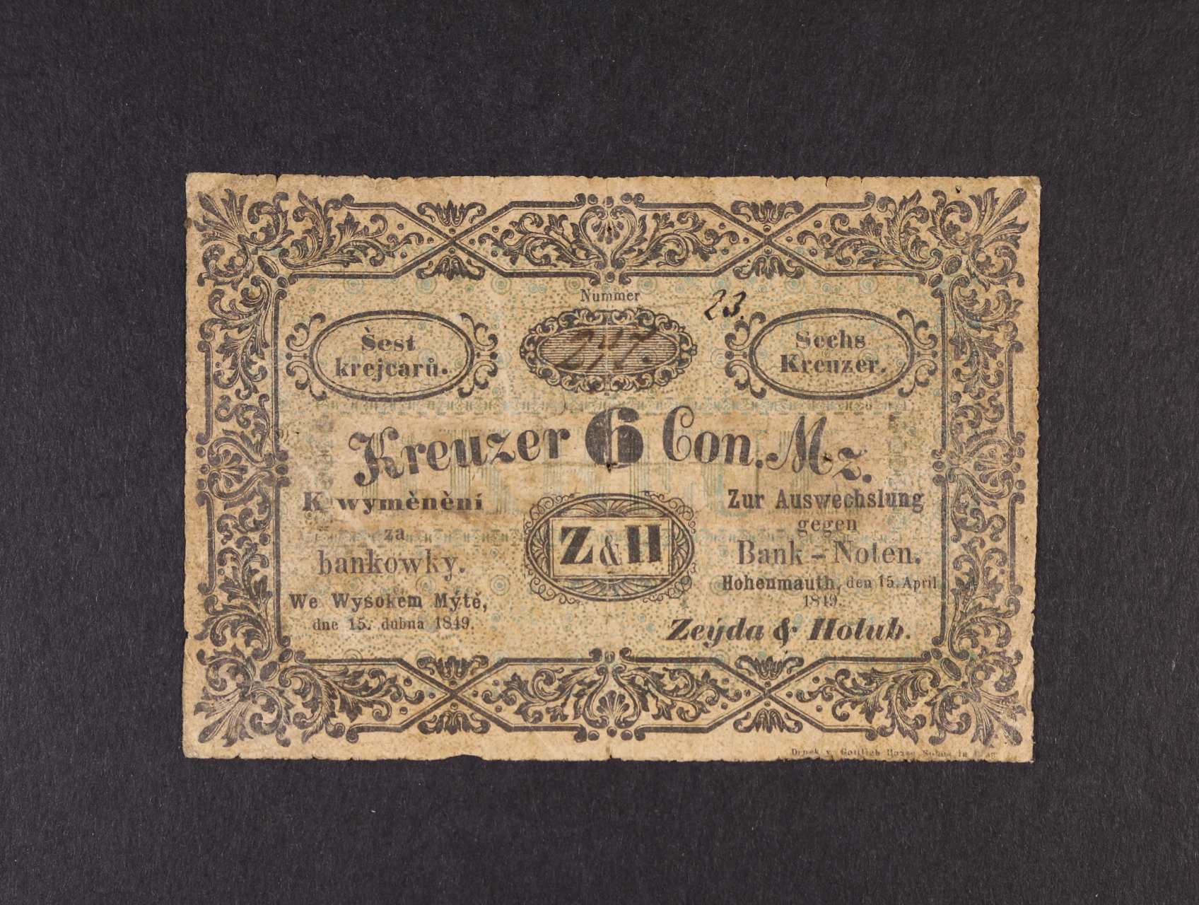 Wysoké Mýto (Vysoké Mýto), 6 kr. C.M. 15.4.1849 Zeýda & Holub, oběhová, V.R. 495.04.02.O