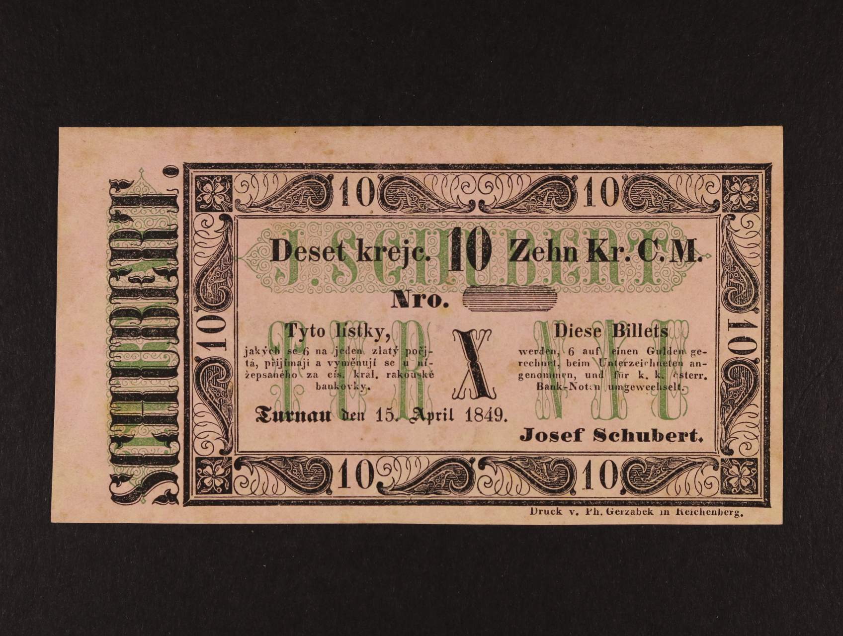 Turnau (Turnov), 10 kr. C.M. 15.4.1849 formulář, zelený podtisk, V.R. 1405.06.06.a.F