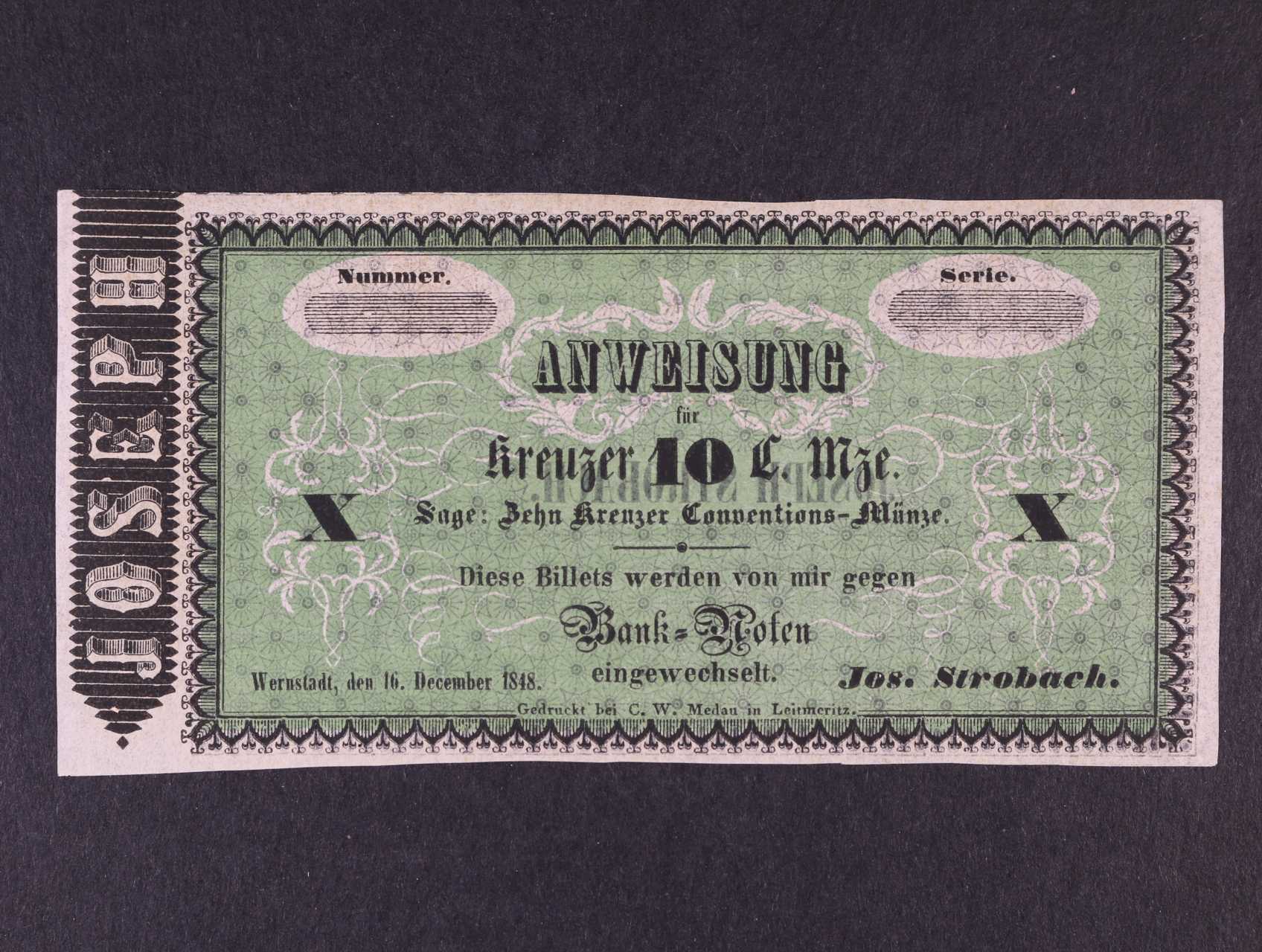 Wernstadt (Verneřice), 10 kr. C.M.16.12.1848 Jos. Strobach, formulář, V.R. 1460.10.05.F