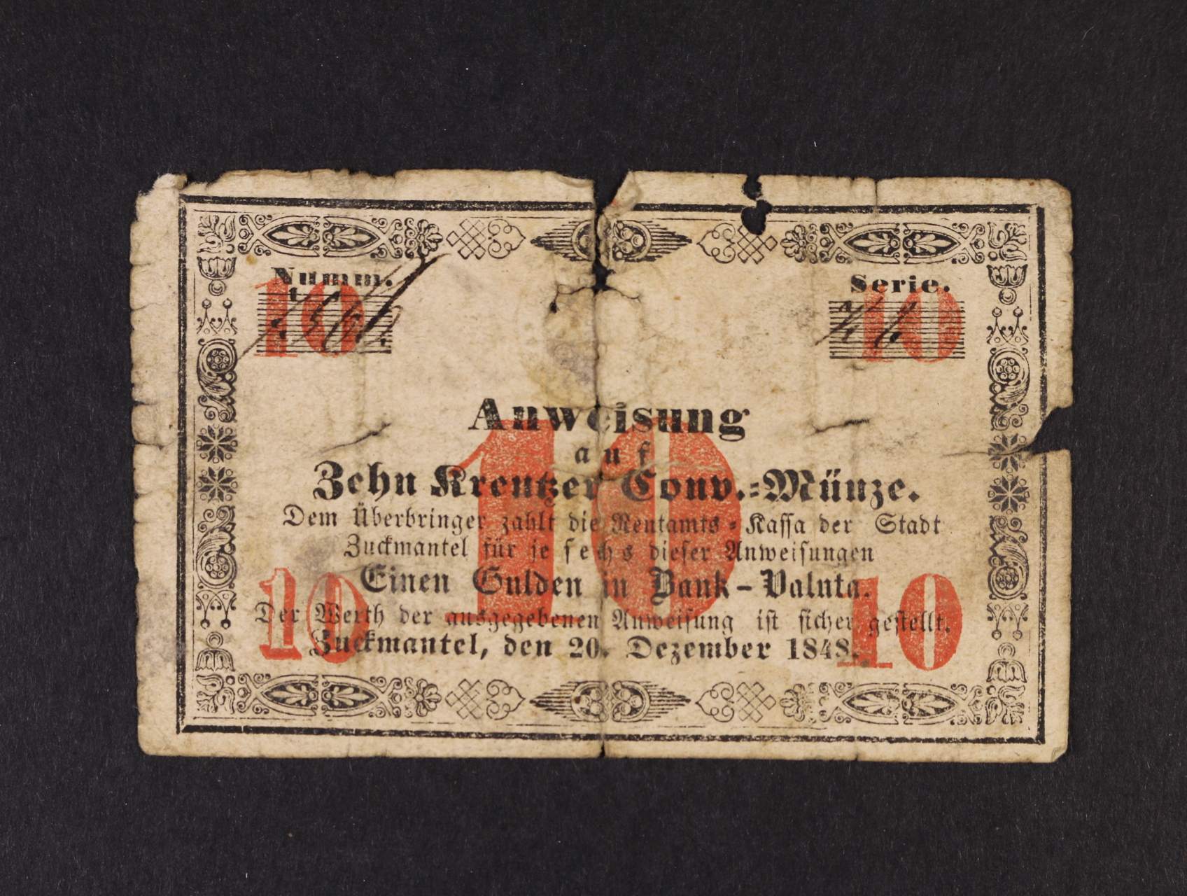 Zuckmantel (Zlaté Hory), 10 kr C.M. 20.12.1848 Rentams Kassa, V.R. 1530.02.02.O