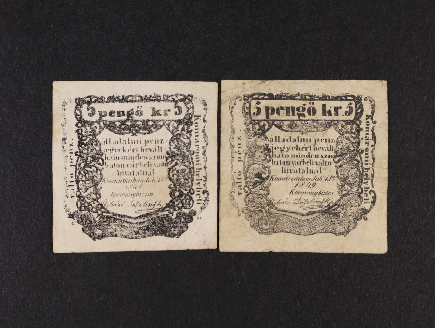 Komárom (Komárno) 5 pengö kr. 13.6.1849 2ks - varianty, Ro. B20a, B20b, Adam. KOM-3.1