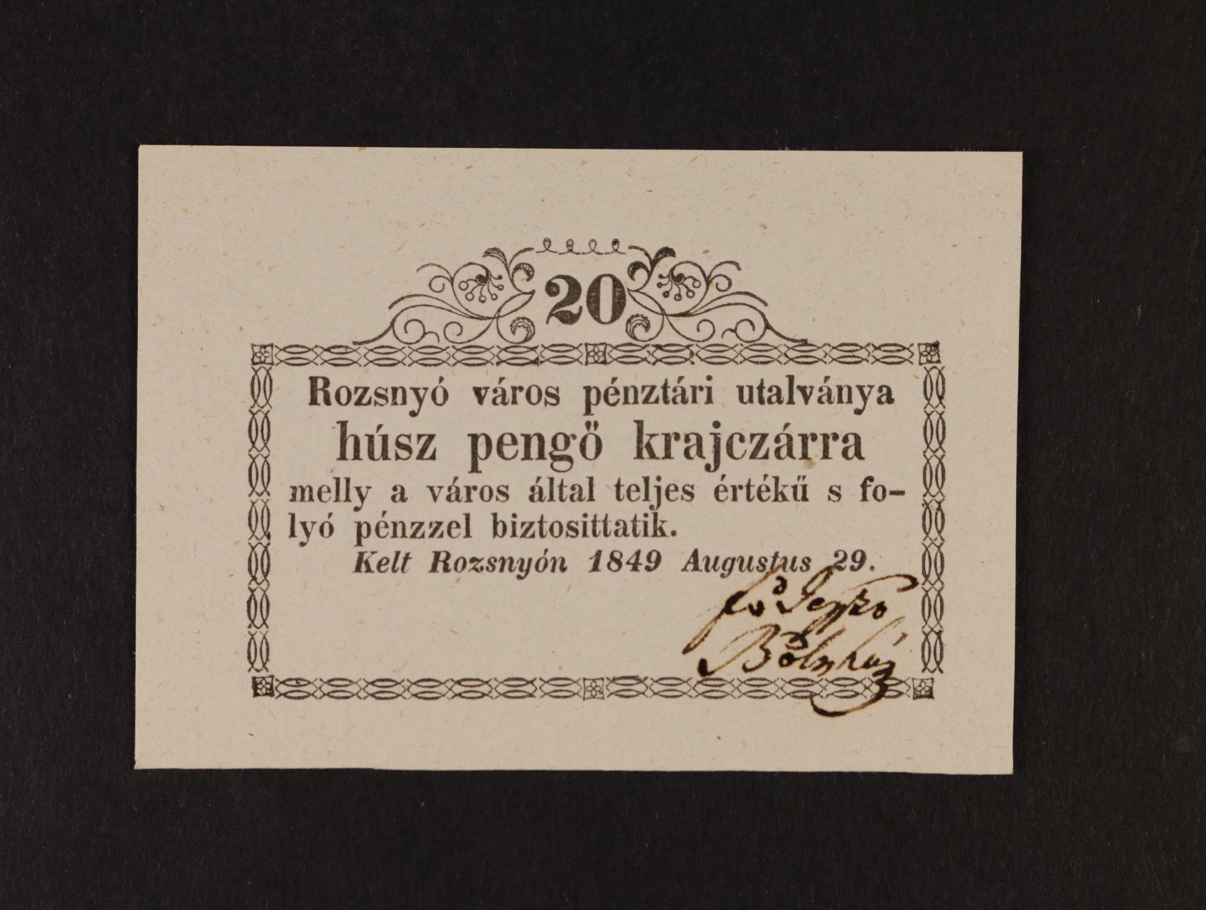 Rozsnyó (Rožňava), 20 kr. 29.8.1849, Adam. ROZ-2.1