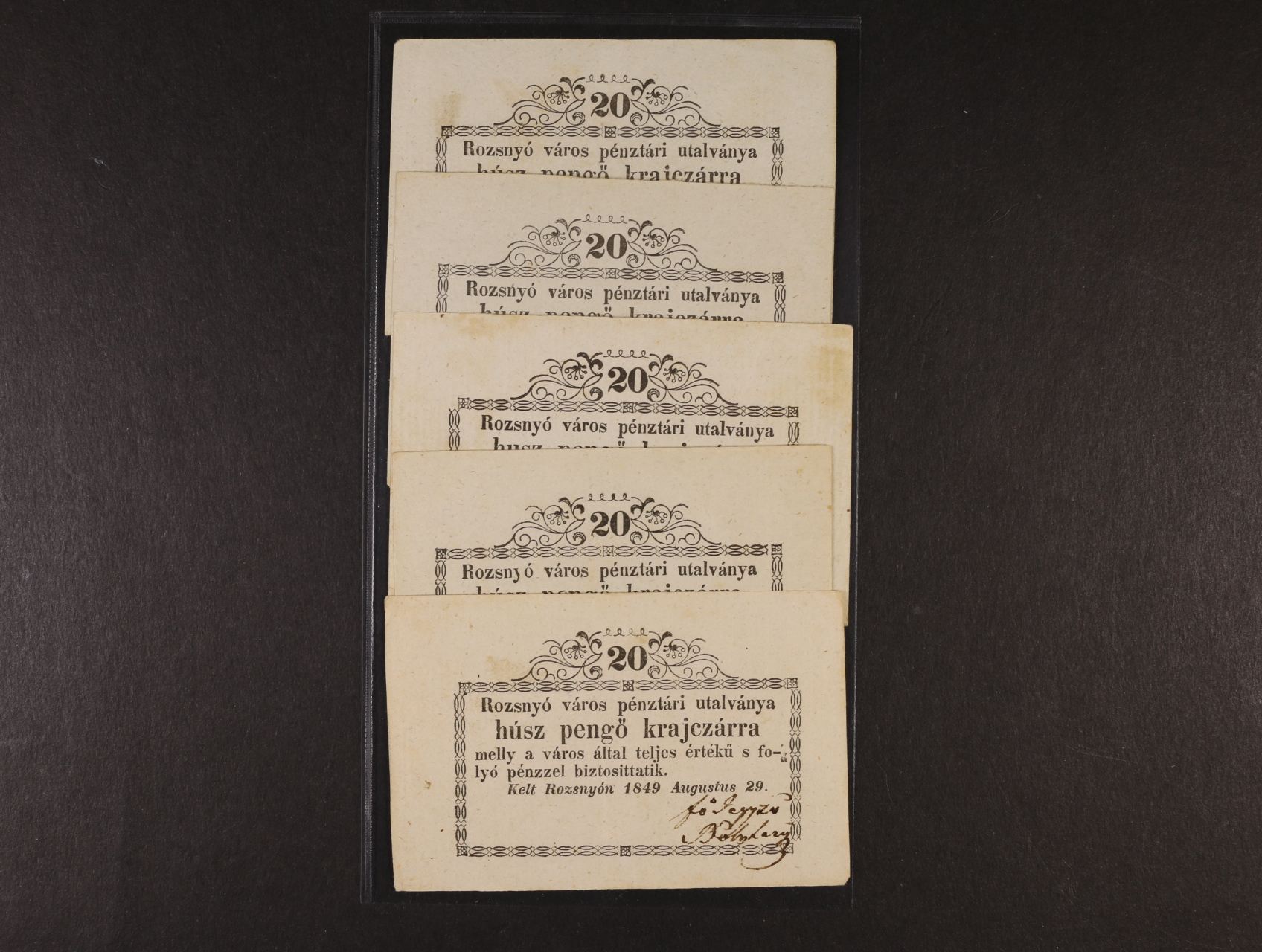Rozsnyó (Rožňava), 20 kr. 29.8.1849, 5ks, různé varianty, Adam. ROZ-2.1