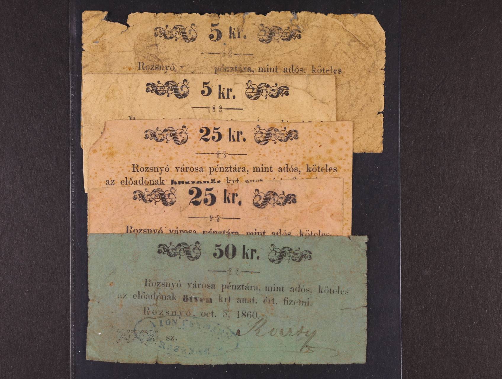 Rozsnyó (Rožňava), 5 kr. 5.10.1860 2x varianta, 25 kr. 5.10.1860 2x varianta a 50 kr., Adam. ROZ-3.1.1, 3.1.2, 3.2.1, 3.2.2, 3.3.1