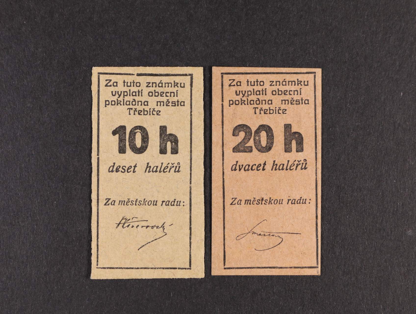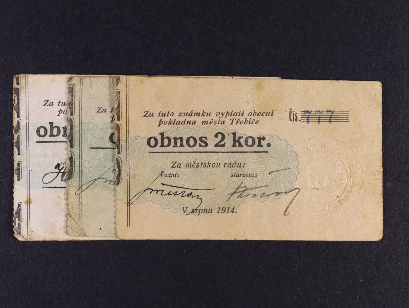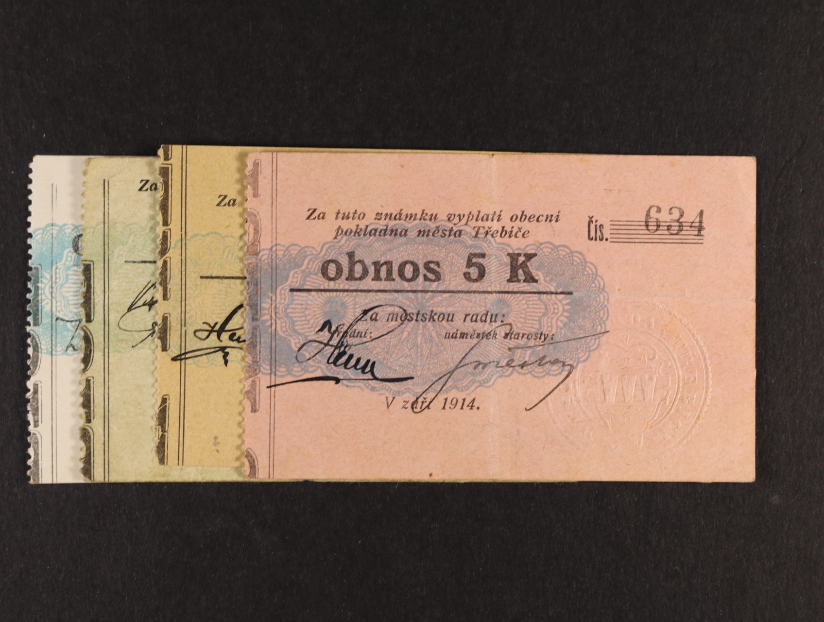 Třebíč, 50 h, 1 K, 2 K srpen 1914 Městská rada, D.H. 211.3d, 5a, 6a