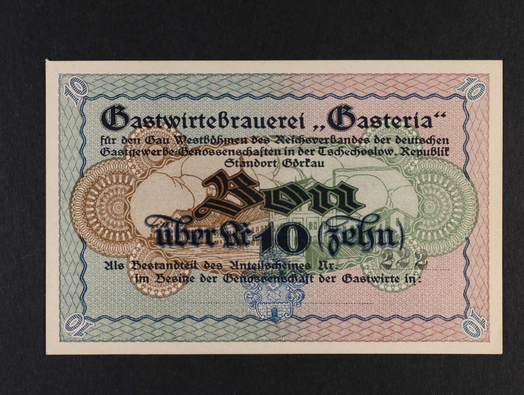 Görkau (Jirkov), Bon 10 Kč b.d. Gastwirtebrauerei "Gasteria"