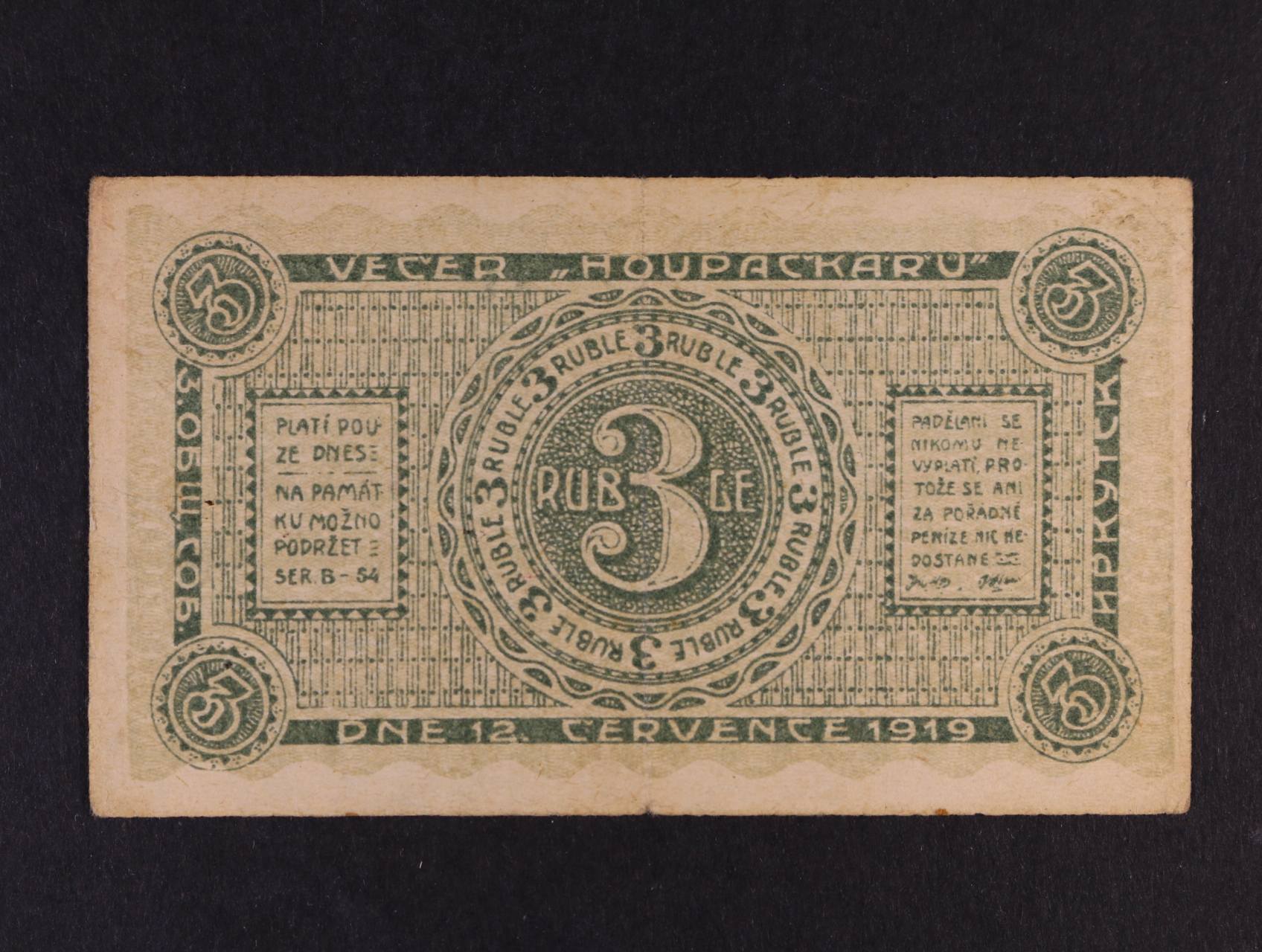 Legionářské poukázky, 3 Ruble 12.7.1919 Irkutsk - Večer houpačkářů, na R 2x raz. Hospodář a 1x v azbuce