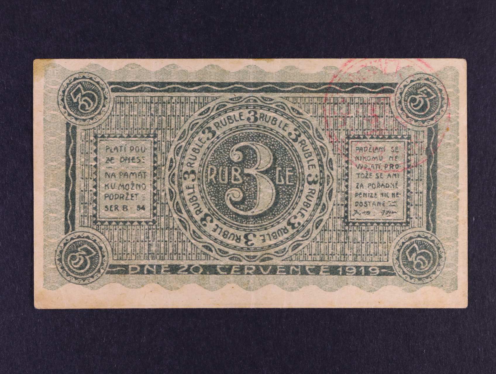 Legionářské poukázky, 3 Ruble 20.7.1919 platí pouze dnes, na A červené raz.