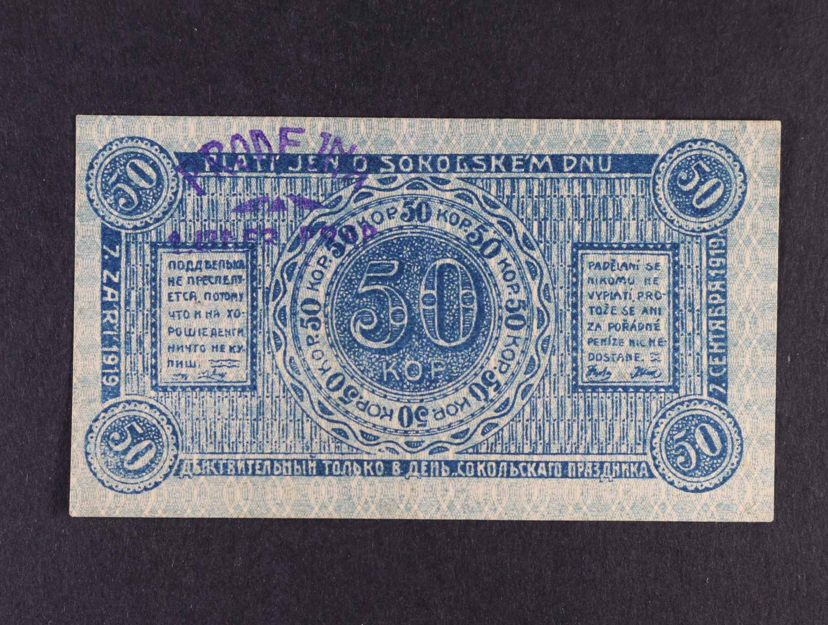 Legionářské poukázky, 50 Kop. 7.9.1919 platí jen o sokolském dnu, na A i R fialové raz. PRODEJNA
