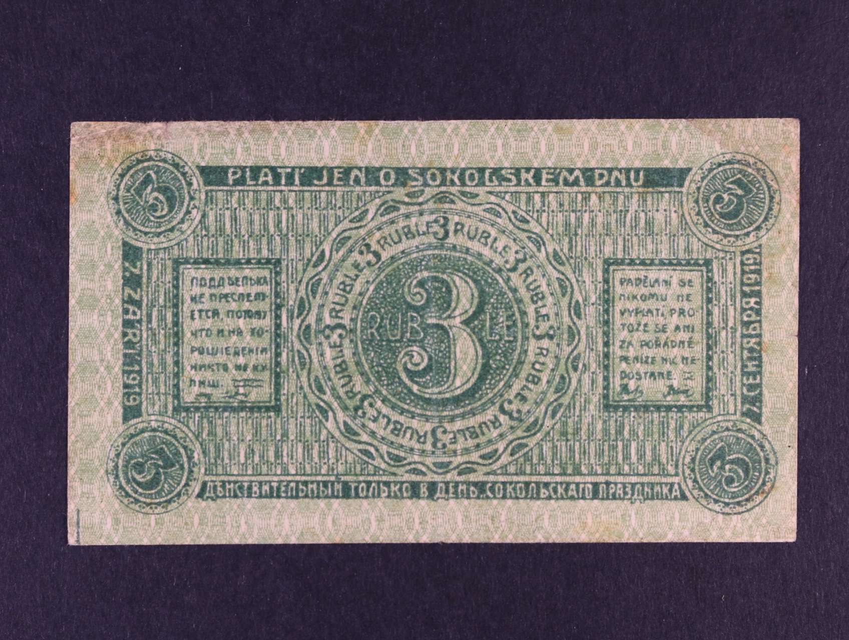 Legionářské poukázky, 3 Ruble 7.9.1919 platí jen o sokolském dnu, bez raz.