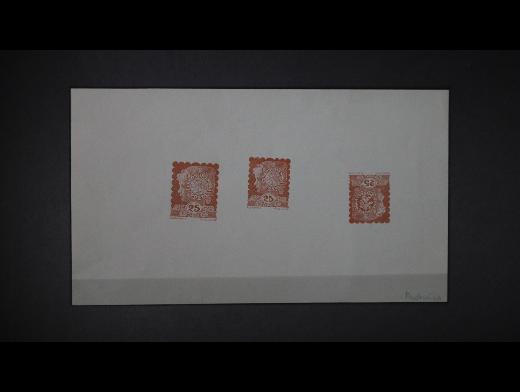 nepřijatý návrh na zn. 25h v soutisku různých velikostí na kousku papíru v barvě červené, autor A. Mudruňka