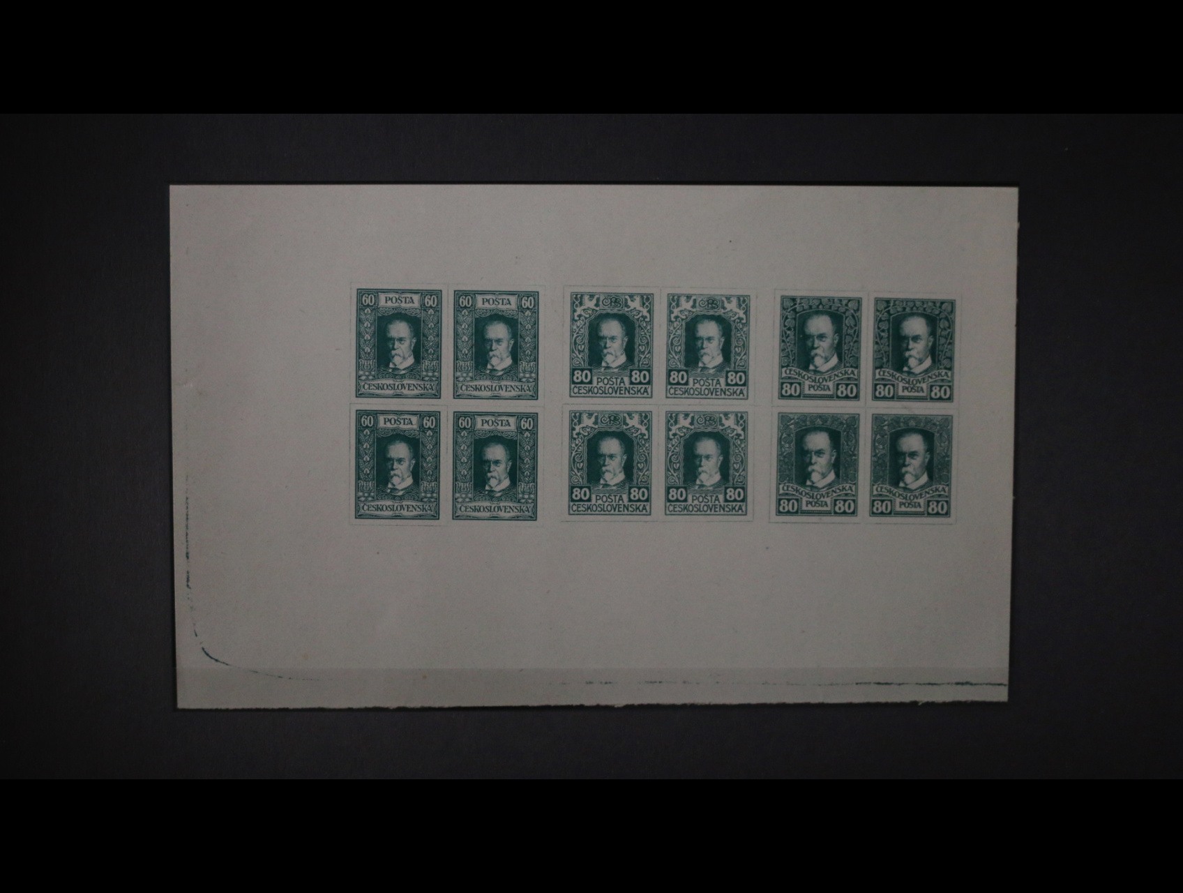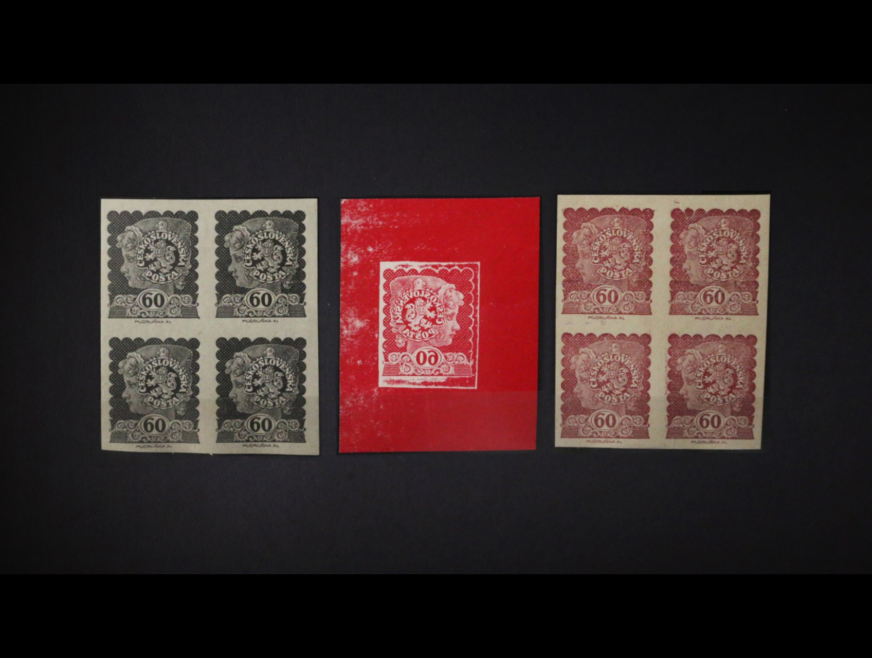 sestava 2 ks čtyřbloků zn. 60h dívčí hlavička na známkovém papíře a stejný námět jedna zn. v aršíkové úpravě (negativní tisk) v barvě červené z nevyčištěné desky na kříd. papíře