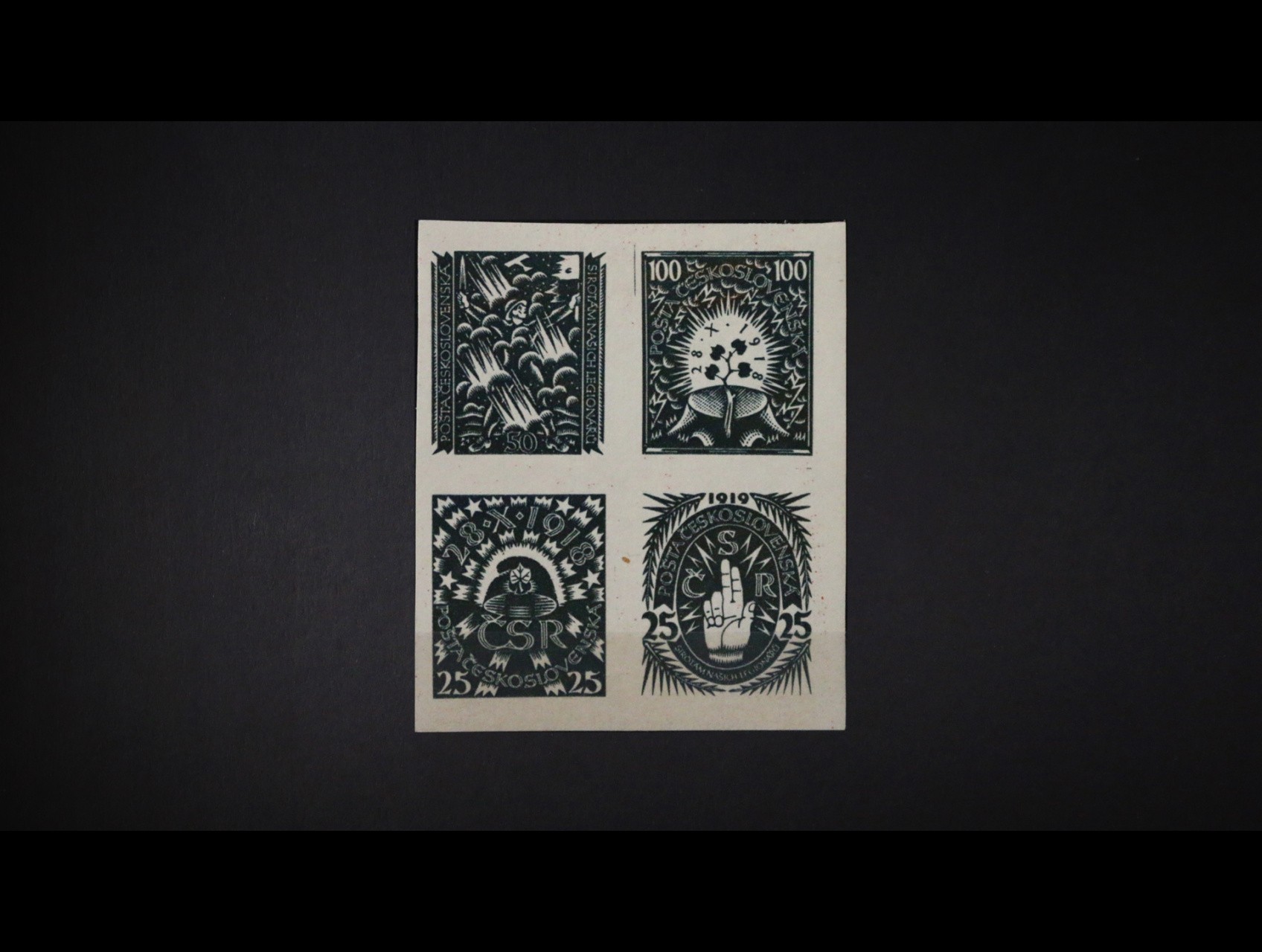 nepřijatý návrh od J. Bendy - čtyři různé návrhy v soutisku z druhé soutěže v hodnotách 2x 25h, 50h a 100h s legionářskými náměty v barvě černé na papíře s lepem, na horních zn. nepatrná stopa po nál., mezi zn. dřívko v papíru
