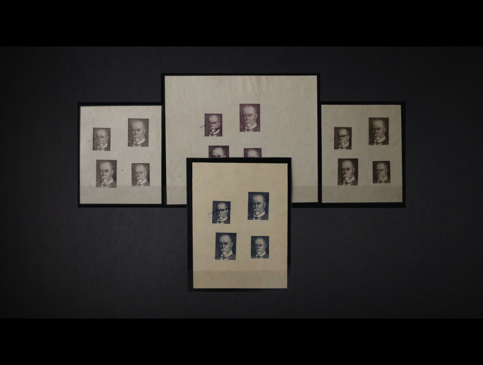 sestava 4 ks soutisků (čtyřbloků) rytin portrétu TGM bez hodnoty v barvě hnědé, světlehnědé, tmavěmodré a fialové