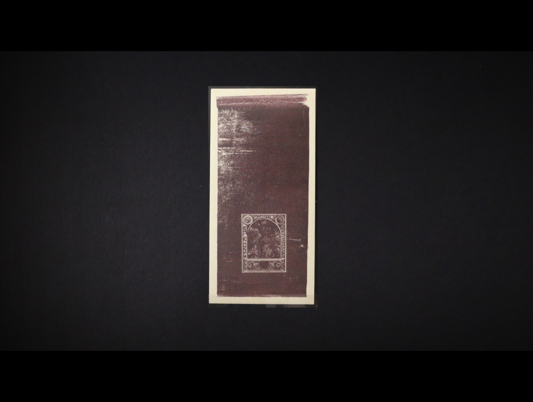 nepřijatý návrh z první soutěže od A. Muchy "Matka Slávie" v barvě fialové z nevyčištěné desky na papíře s lepem, malý formát, na horním a spodním okraji nepatrná nálepka