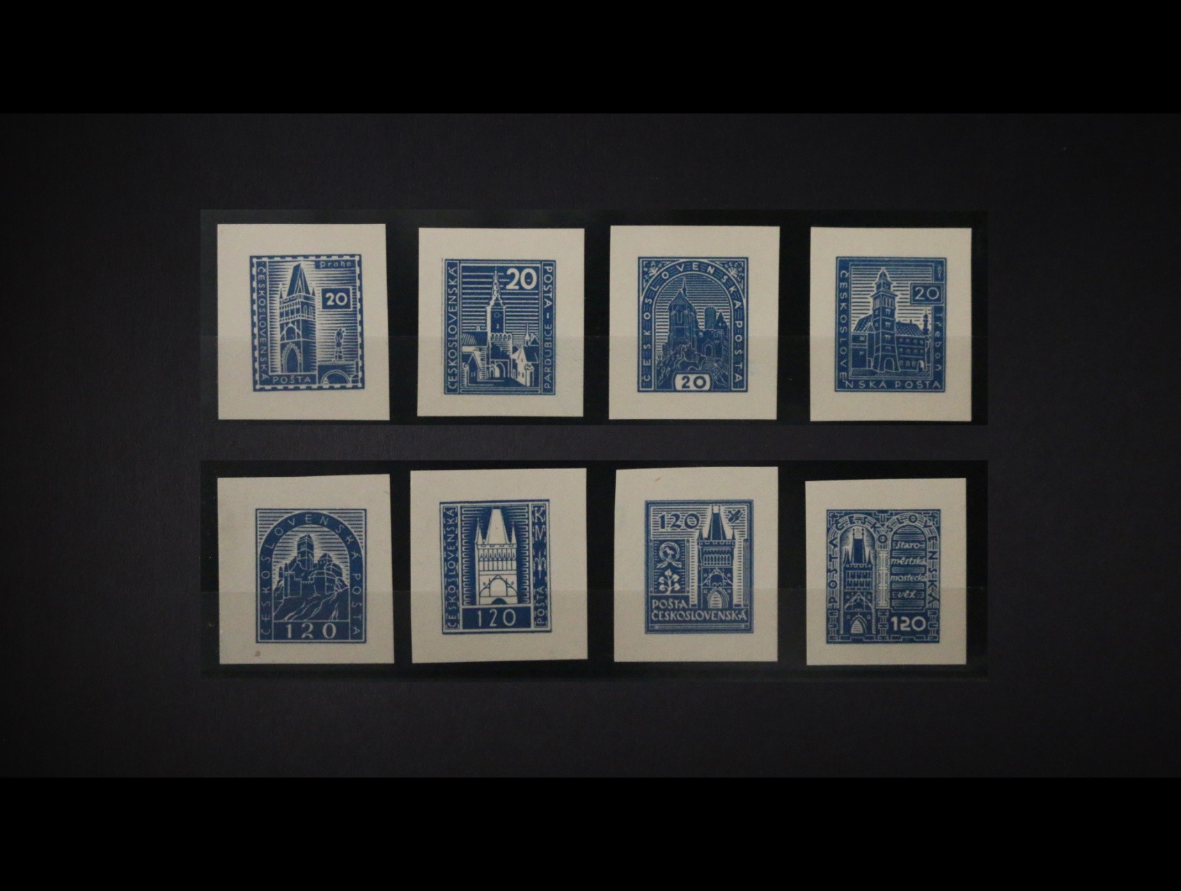 sestava 8 ks nepřijatých návrhů na zn. hodnoty 20 a 120h v modré barvě na kříd. papíře