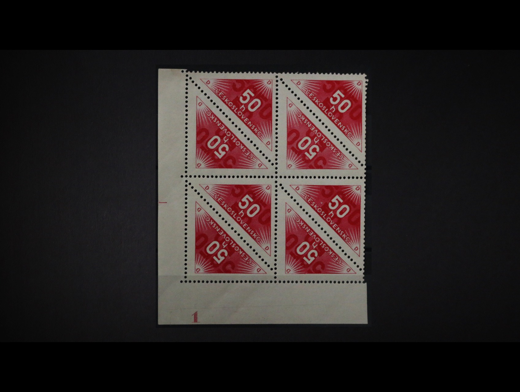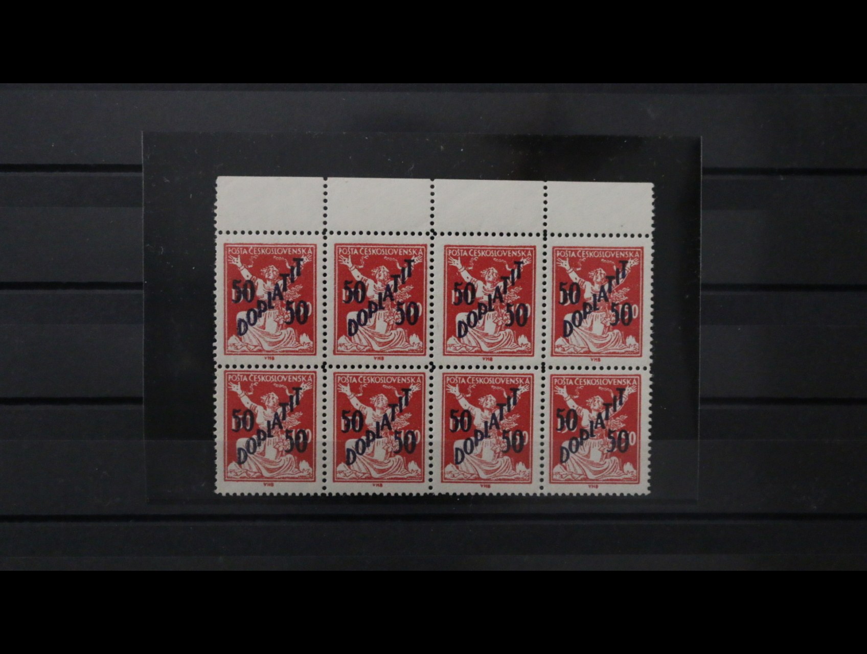 zn. DL č. 50 B ST v 8mi-bloku s horním okrajem, na jedné zn. nepatrná stopa po nál., kat. cena cca 2600 Kč