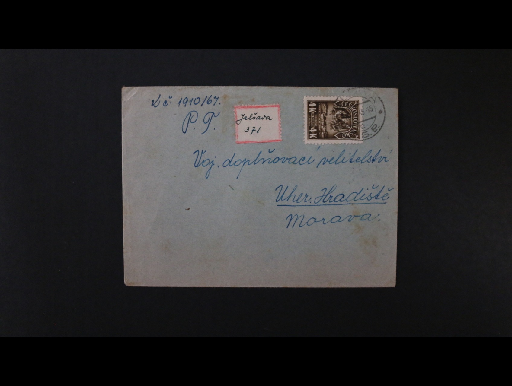R-dopis do Uh. Hradiště s proviz. R-nálepkou a pod. raz. JELŠAVA 16.11.45 + přích. raz. UHERSKÉ HRADIŠTĚ 19.11.45