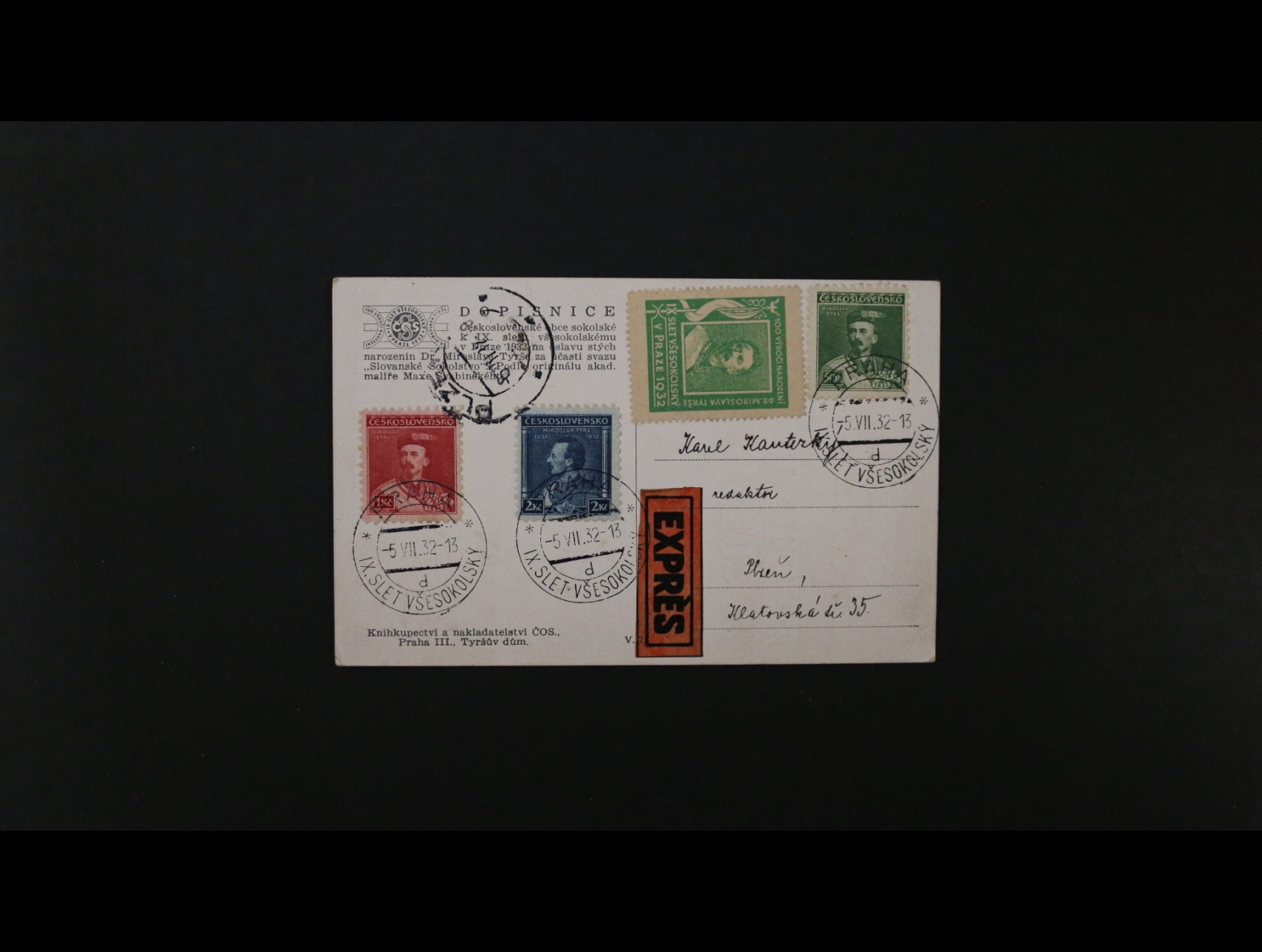 EXPRES barevná pohlednice z IX. všesokolského sletu s pod. raz. PRAHA 5.7.32 IX. SLET VŠESOKOLSKÝ, přích raz. a sletová rekl. nálepka, lux. kvalita