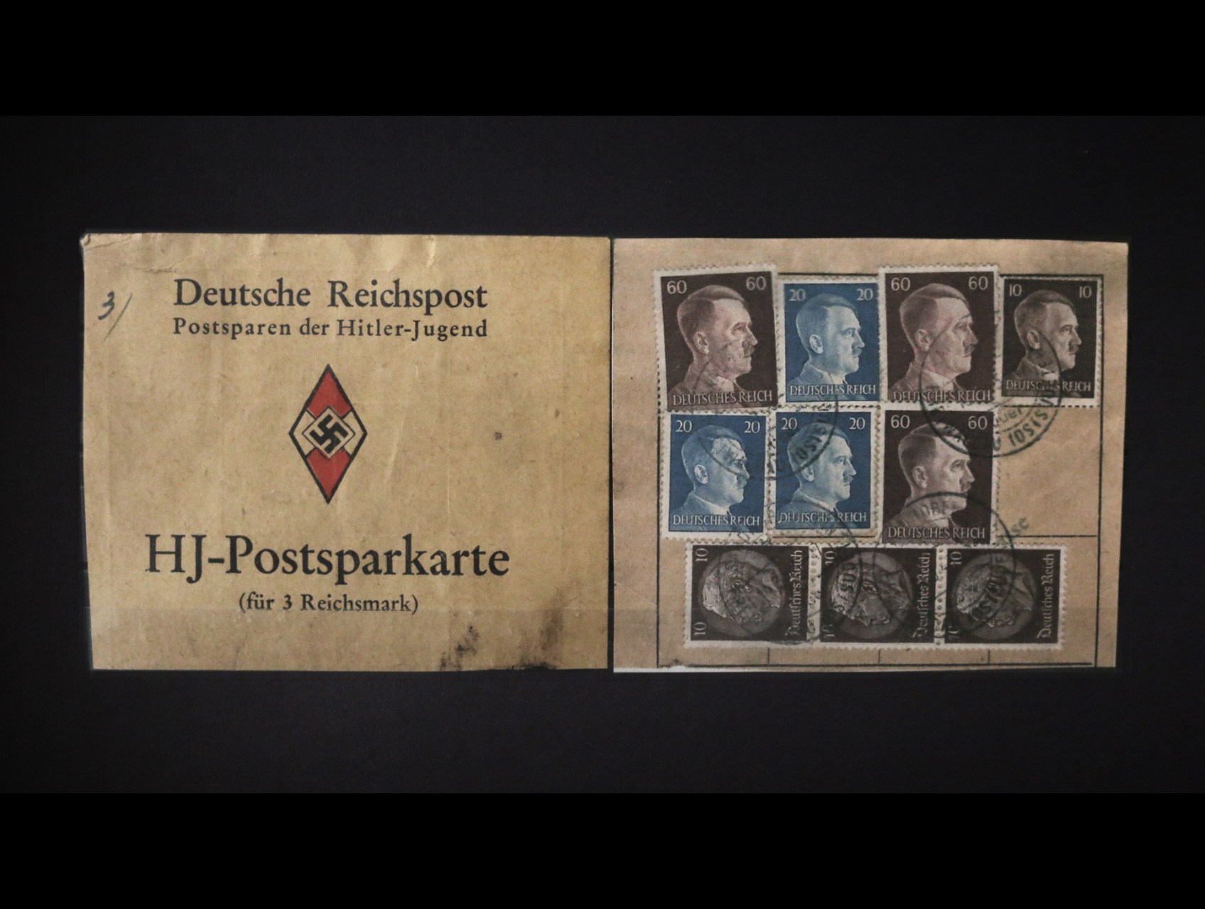 poštovní spořitelní karta pro H.-Jugend s vylepenými německými známkami Hindenburg a A.H. s raz. FREIWALDAU ... 19.3.43, zajímavé