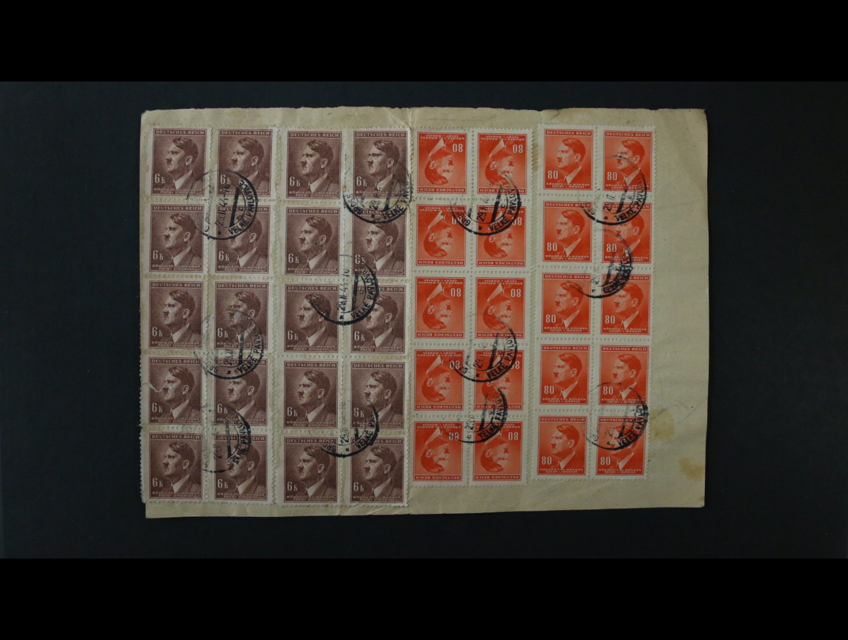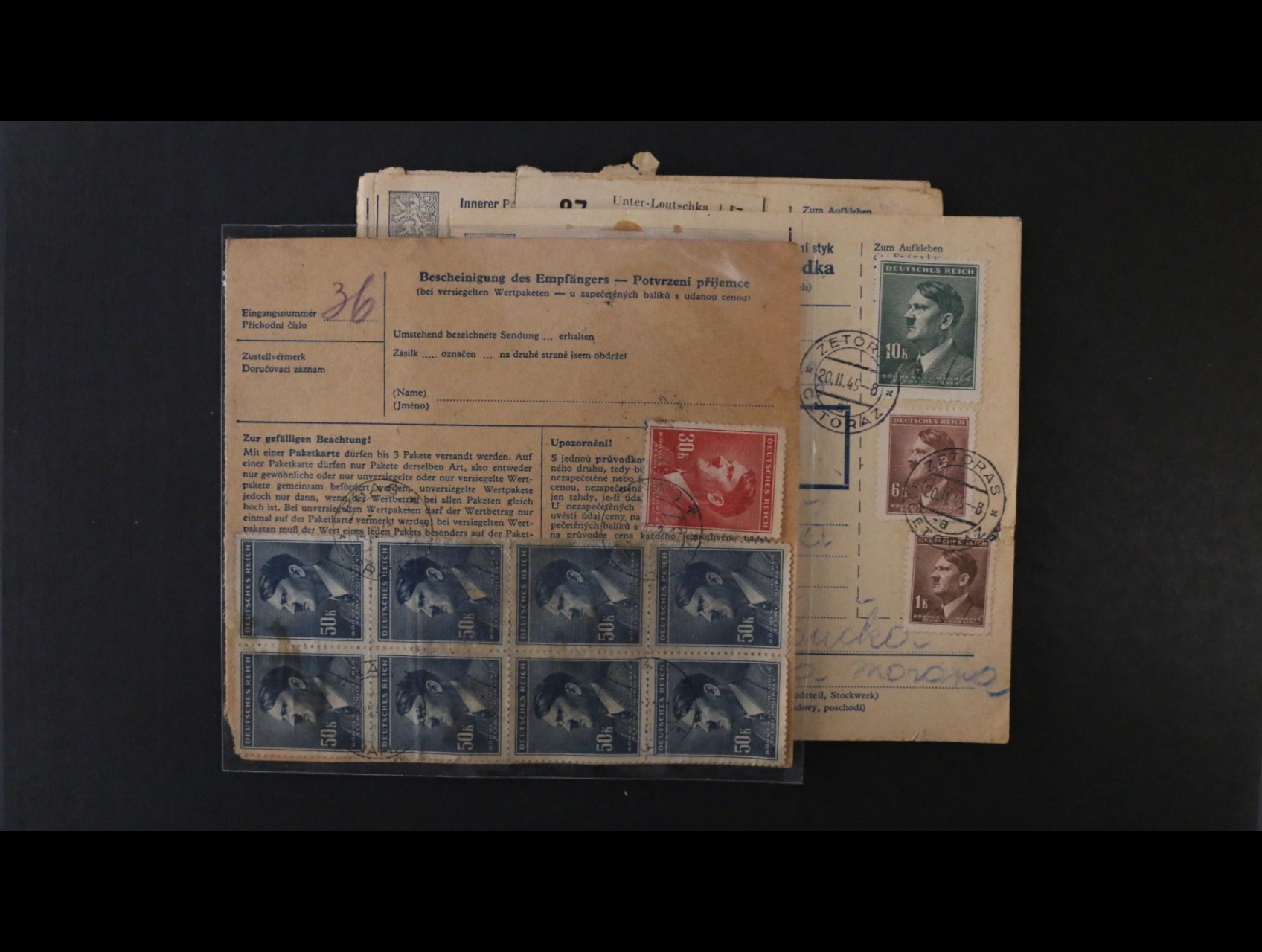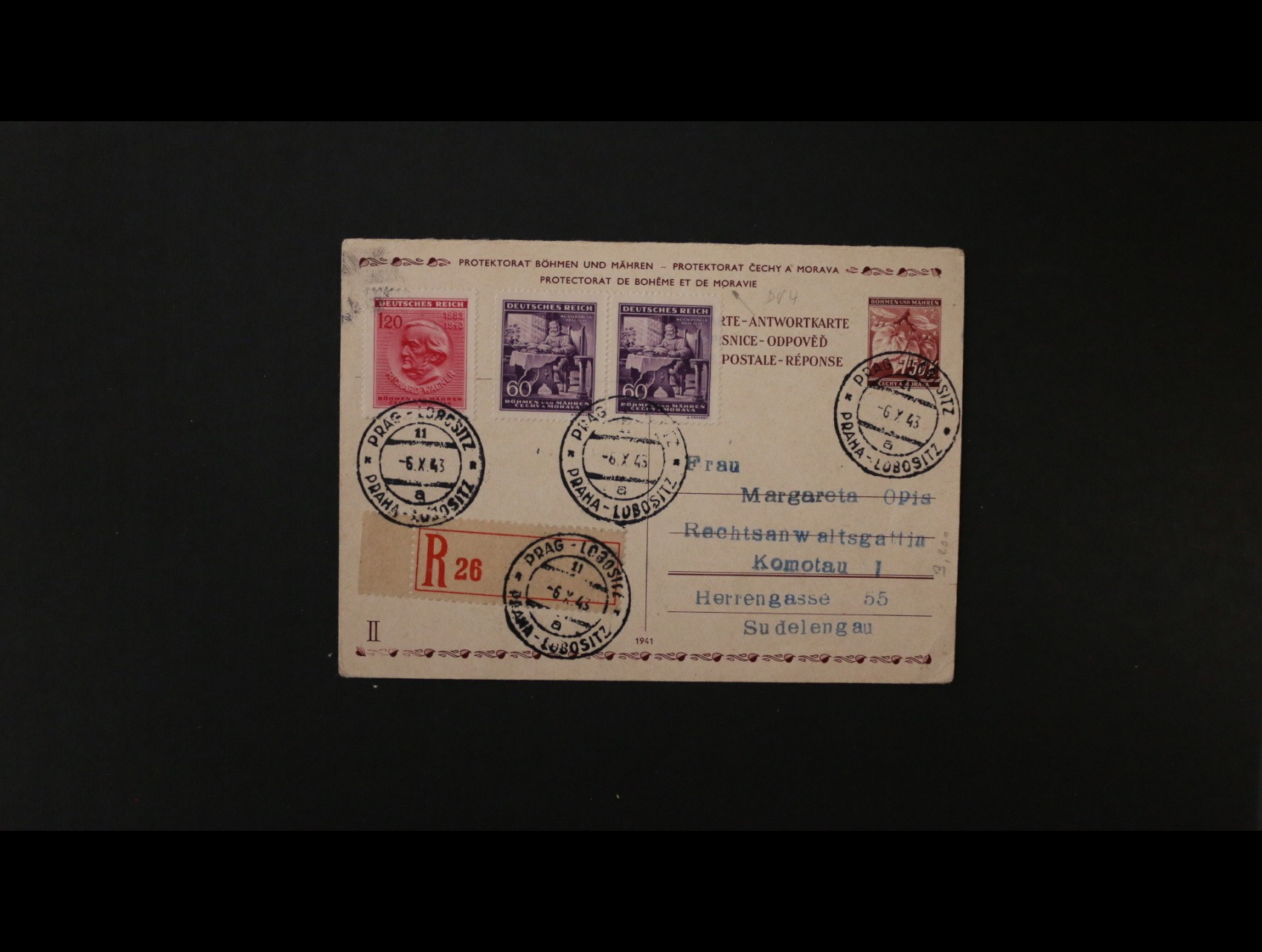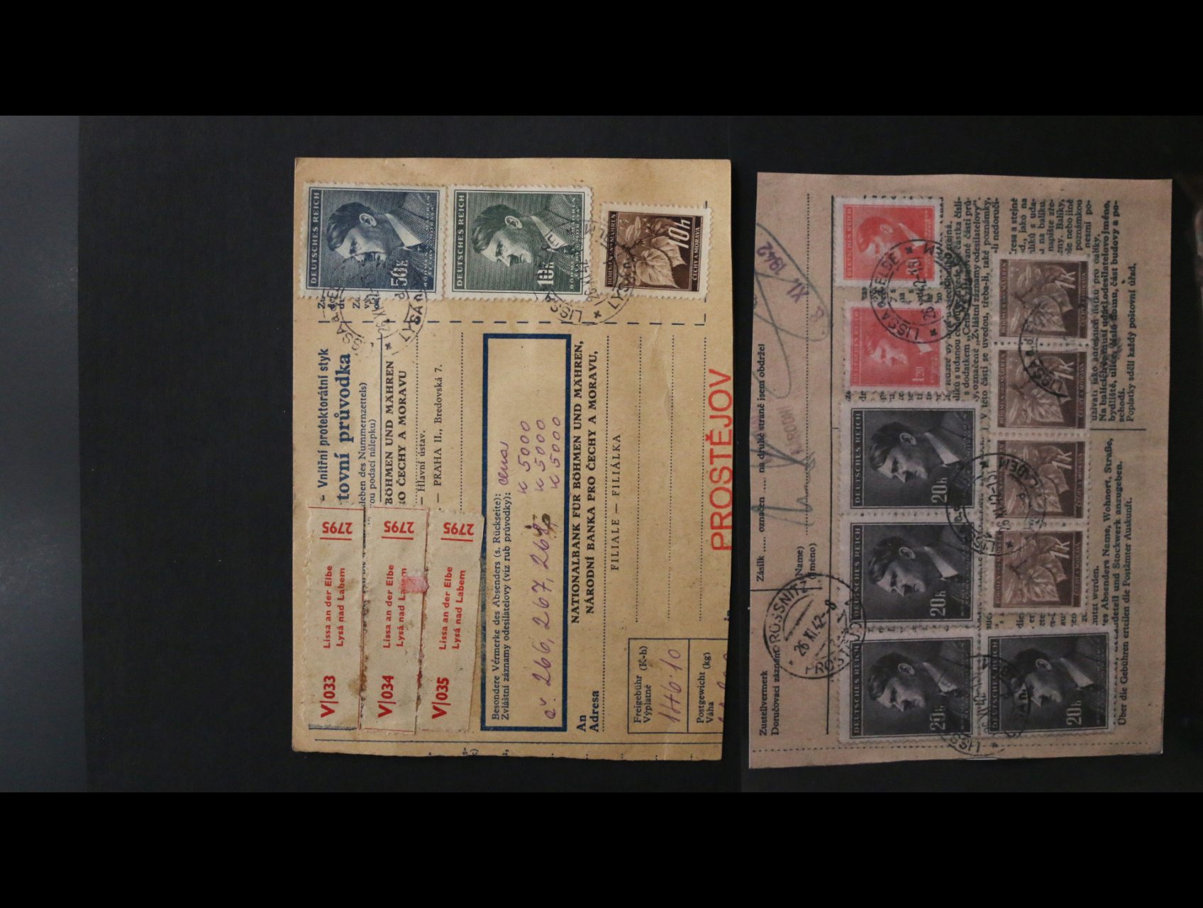 poštovní průvodka frank. na přední straně zn. č. 21, 96, 99, pod. raz. LISSA a. d. ELBE 26.9.42, na zadní straně dofrank. zn. 56 ve vodorovné čtyřpásce, 85 (2x), 97 (4x), pod. raz. LISSA a.d. ELBE, přích. raz. PROSSNITZ 26.9.42