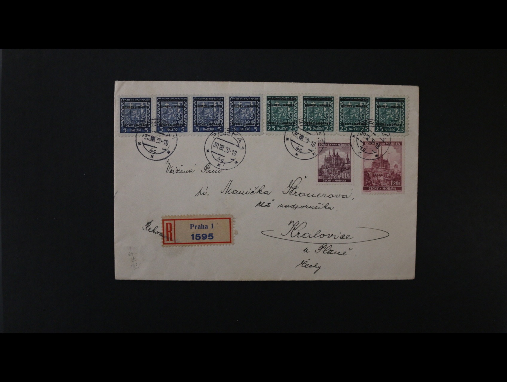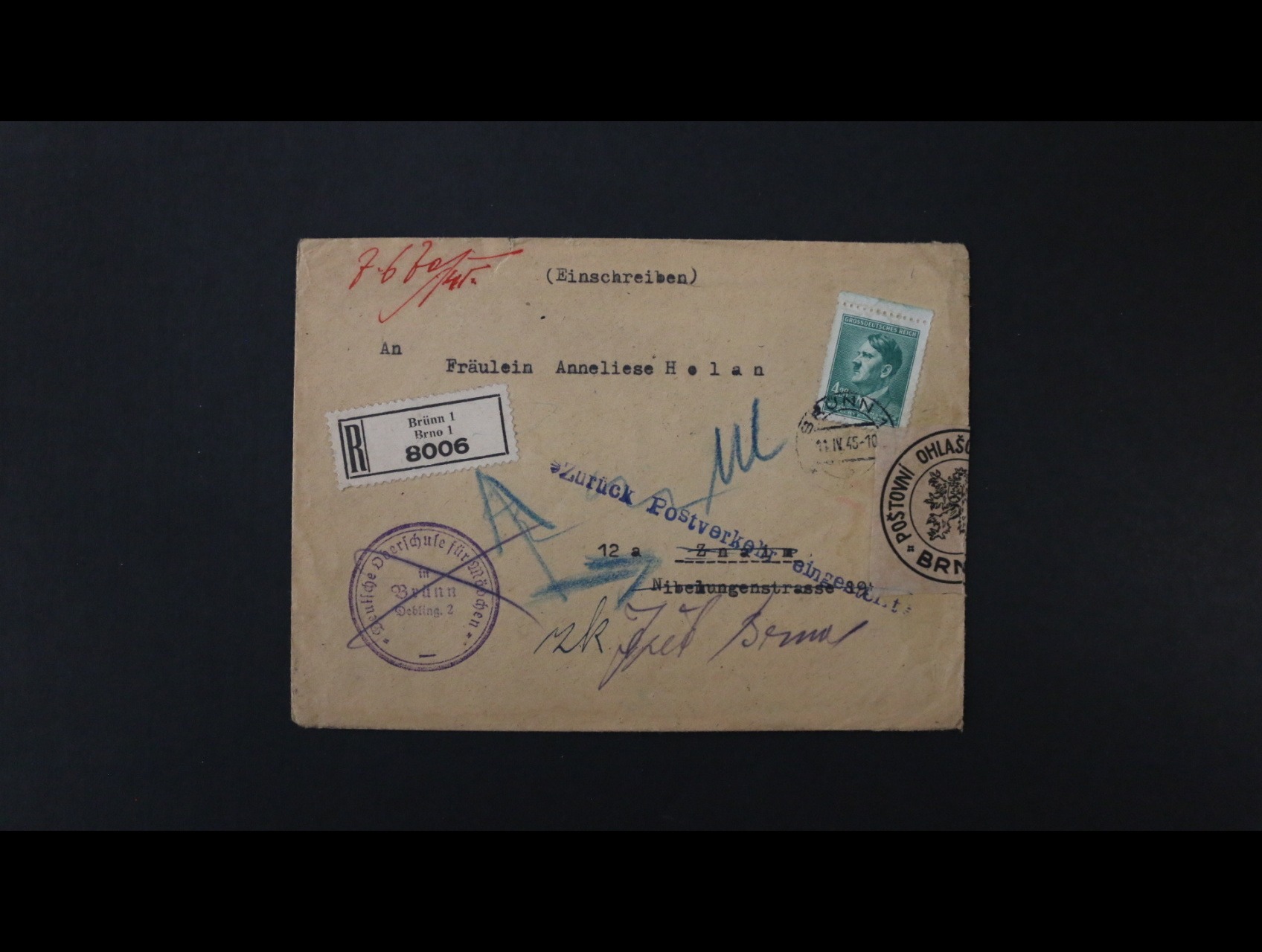 úřední R-dopis do Znojma frank. zn. č. 122, pod. raz. BRÜNN 1 11.4.45, nedoručen, vráceno zpět, příd. řádkové raz. Zurück Postverkehr eingestelt, na pravé str. přelepeno zálepkou POŠTOVNÍ OHLAŠOVNA A ÚLOŽNA BRNO, velmi zajímavý doklad