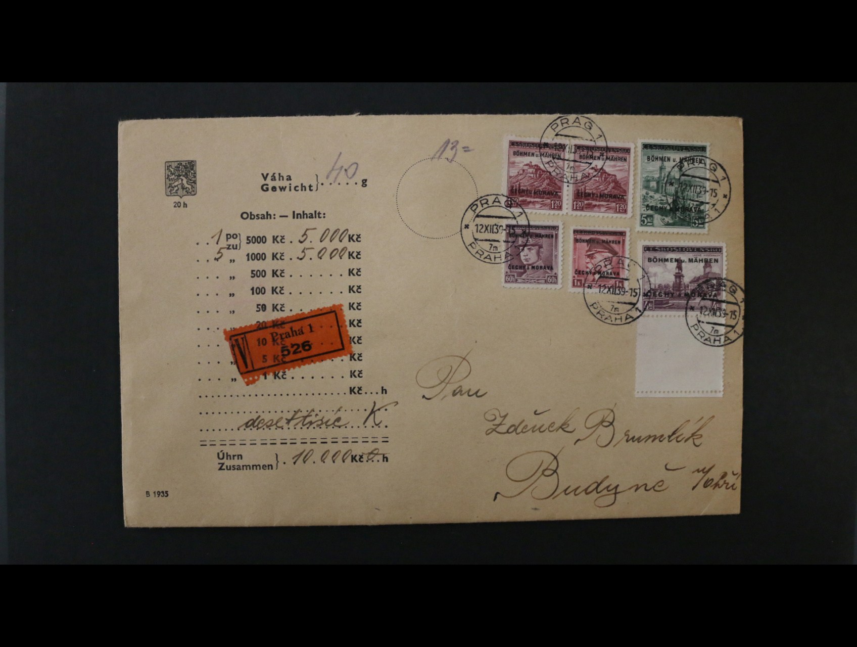 cenné psaní do Budyně na 10000 K frank. zn. č. 8, 10, 11 ve vodorovné dvoupásce, 17 se spodním kuponem, 18, pod. raz. PRAG 12.12.39, na zadní str. neporušené pečetě