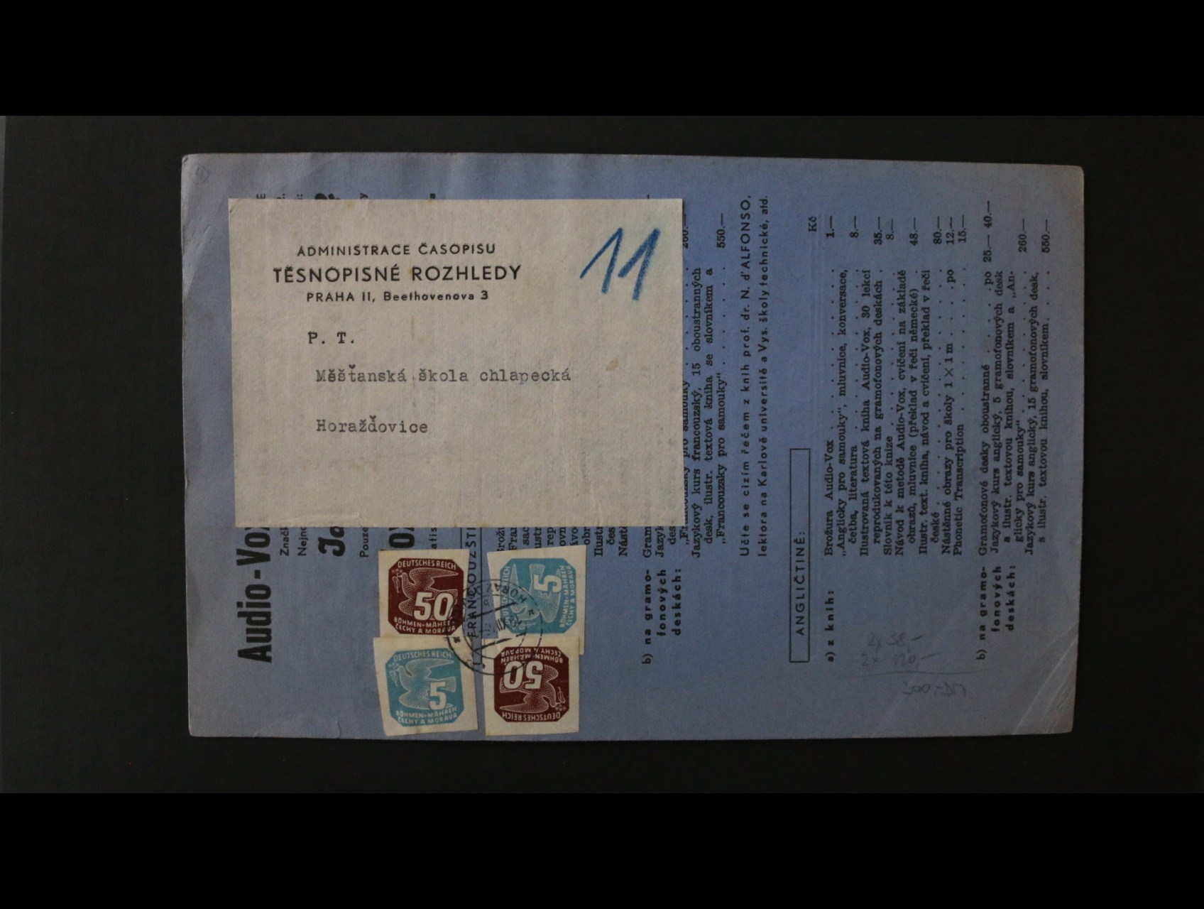 prospekt s kompl. adresním štítkem zaslaný do Horažďovic, frank. novinovou zn. NV 11 (2x) + NV 17 (2x), velmi zajímavá frankatura
