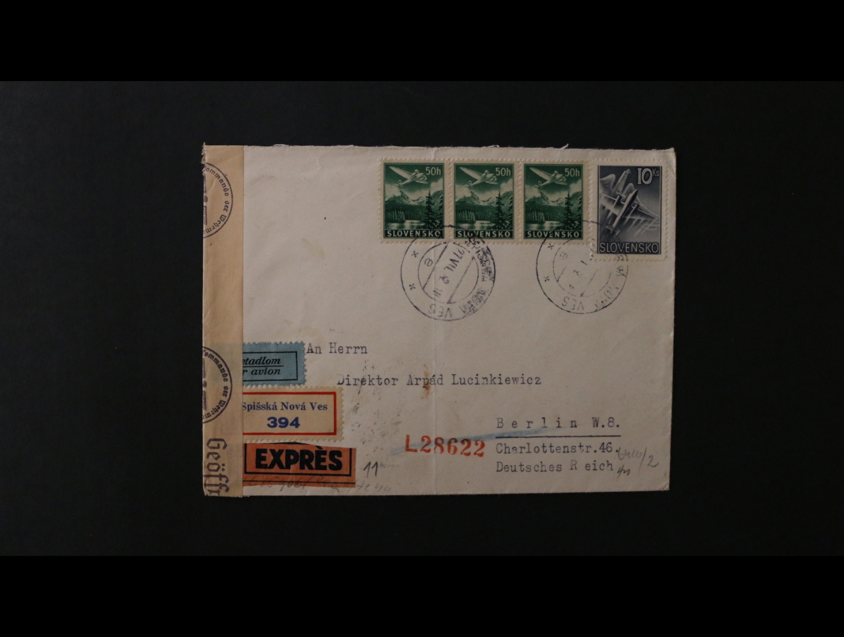 R-EXPRES dopis do Berlína frank. třípáskou zn. L č. 2, zn. L 8, pod. raz. SPIŠSKÁ NOVÁ VES 27.7.42, průch. raz. WIEN 1, přích. raz. BERLIN W 8, cenzurní páska a raz., velmi dobrá kvalita