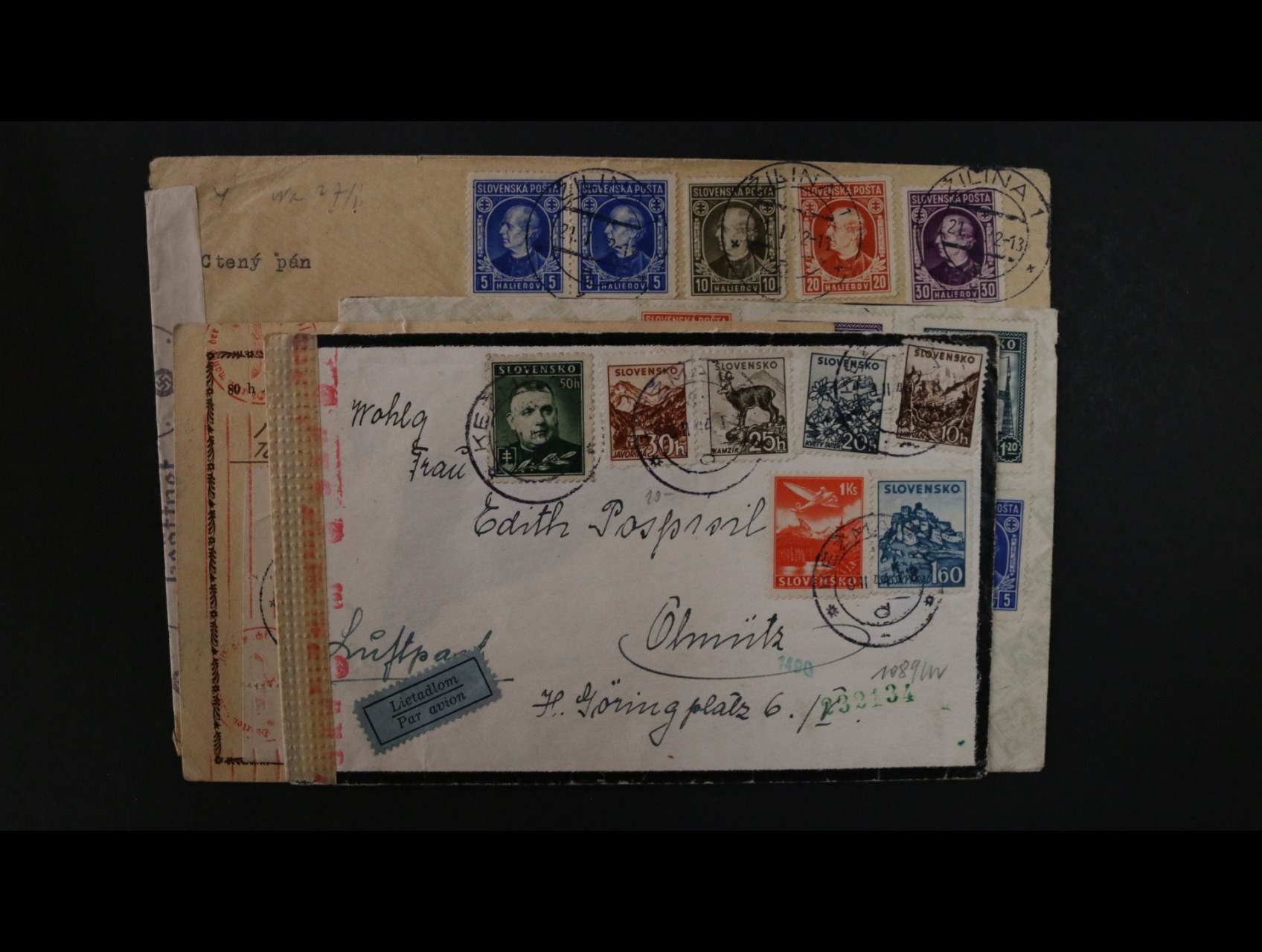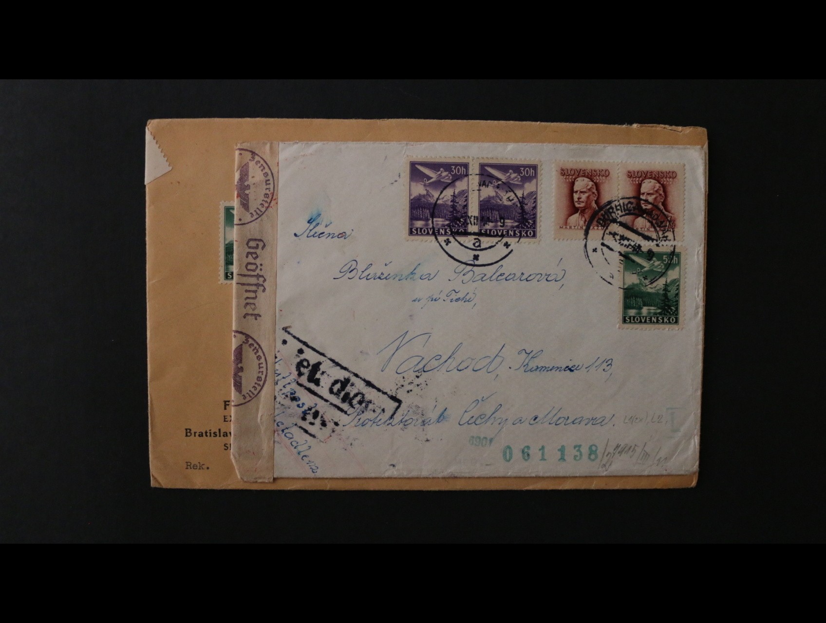 R-dopis do Michalovcí frank. let. zn. 50h, 1Ks ve vodorovné dvoupásce a 4Ks, pod. raz. BRATISLAVA 12.6.43 a dopis do Náchoda frank. mj. zn. L č. 1 ve dvoupásce a L 2, pod. raz. BYSTRICA NAD VÁHOM , přích. raz. NÁCHOD, cenzurní páska a raz., navíc rámečkové příd. raz. LIETADLOM, zajímavé