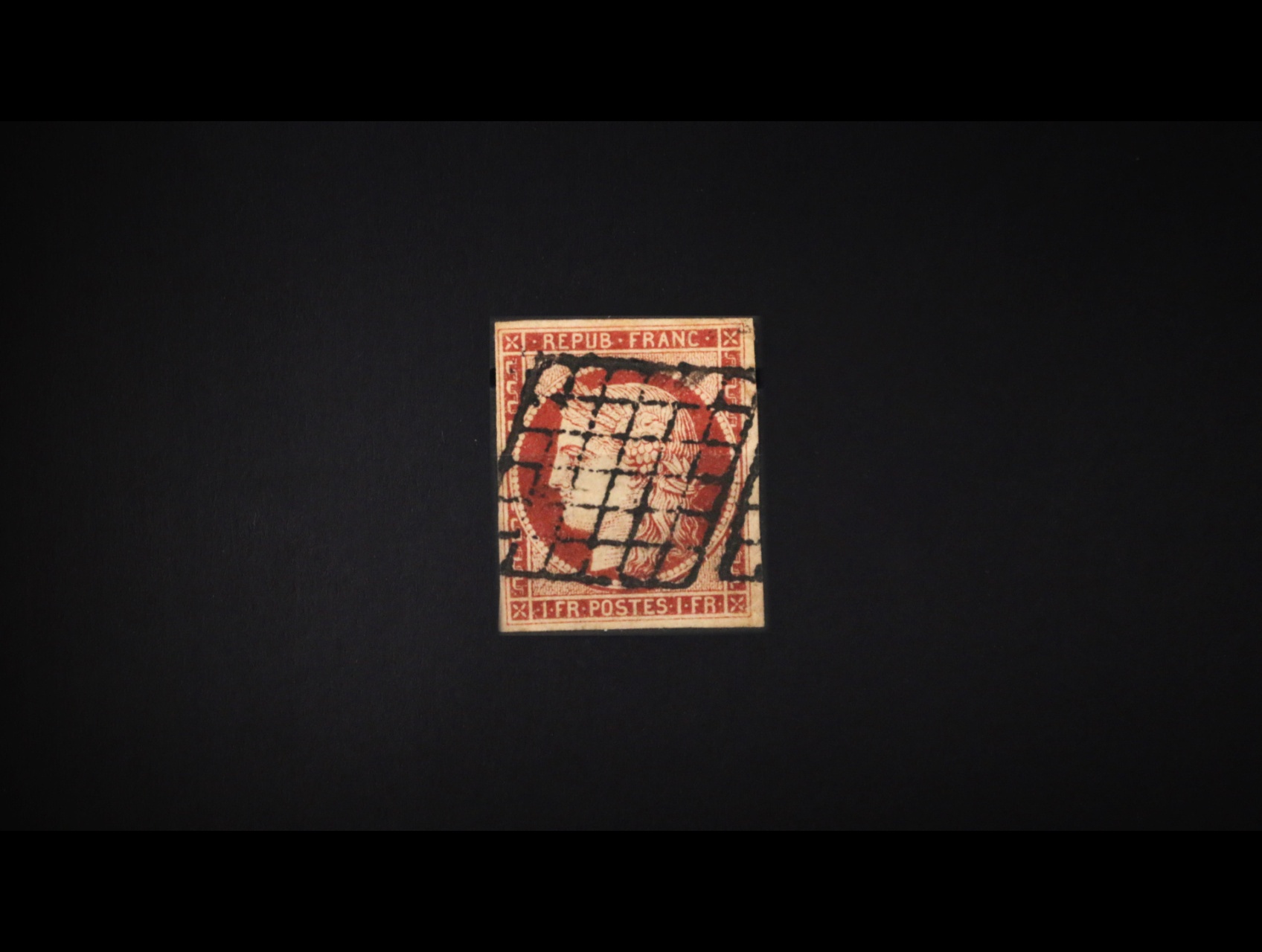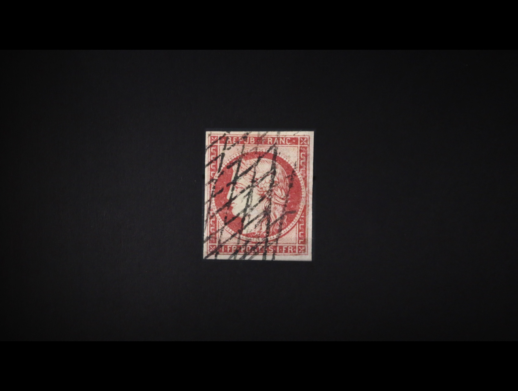 zn. kat. Ma. č. 7a karmínová, pěkný střih, znehodnoc. němým raz., 1000 EUR