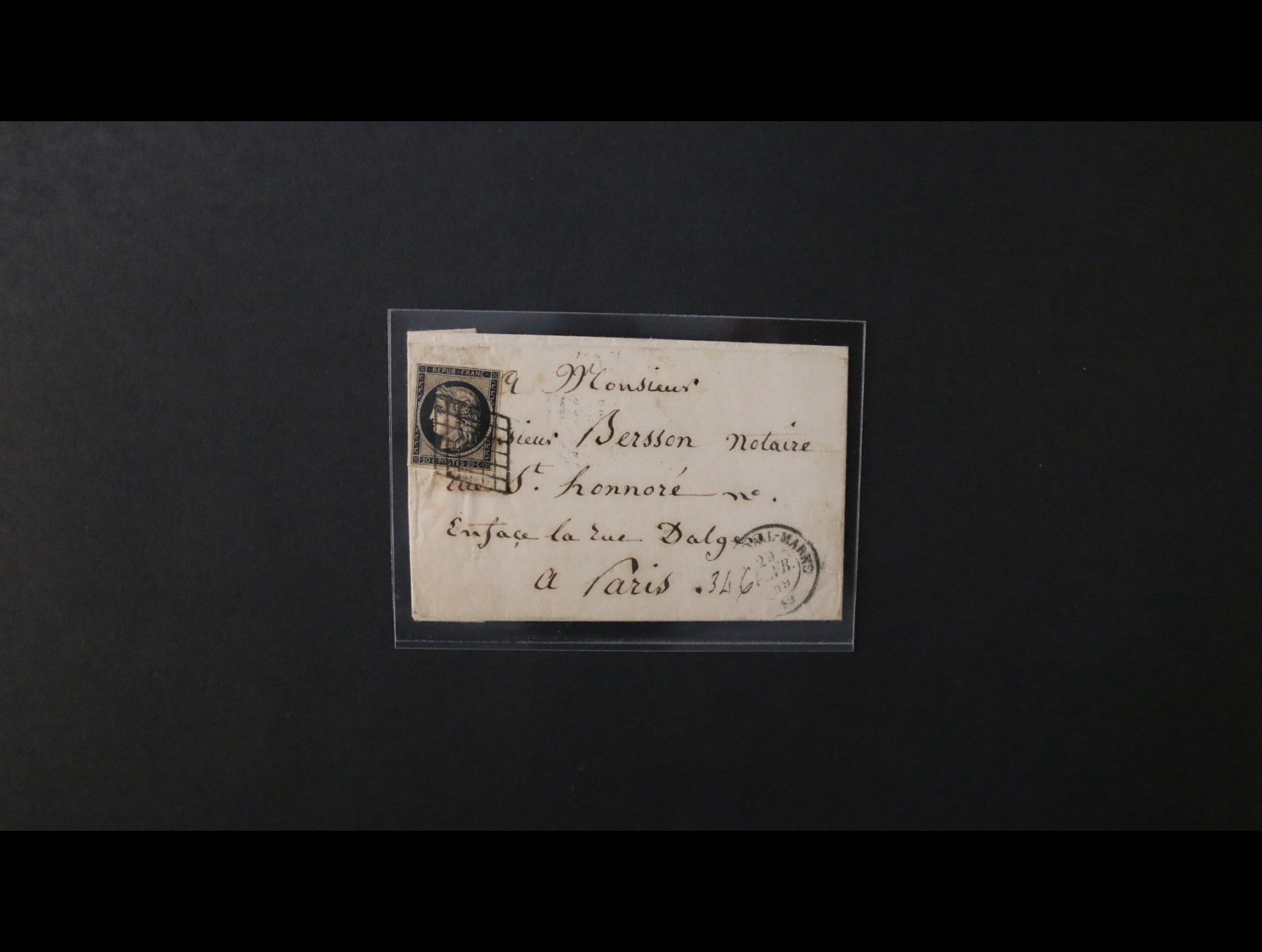 dopis malého formátu do Paříže frank. zn. Ma. č. 3 20c černá, pod. němé raz. + denní raz. ...AL-MARNE 20.FEVR.1849, přích. raz. 21.FEVR.1849, dobrá kvalita
