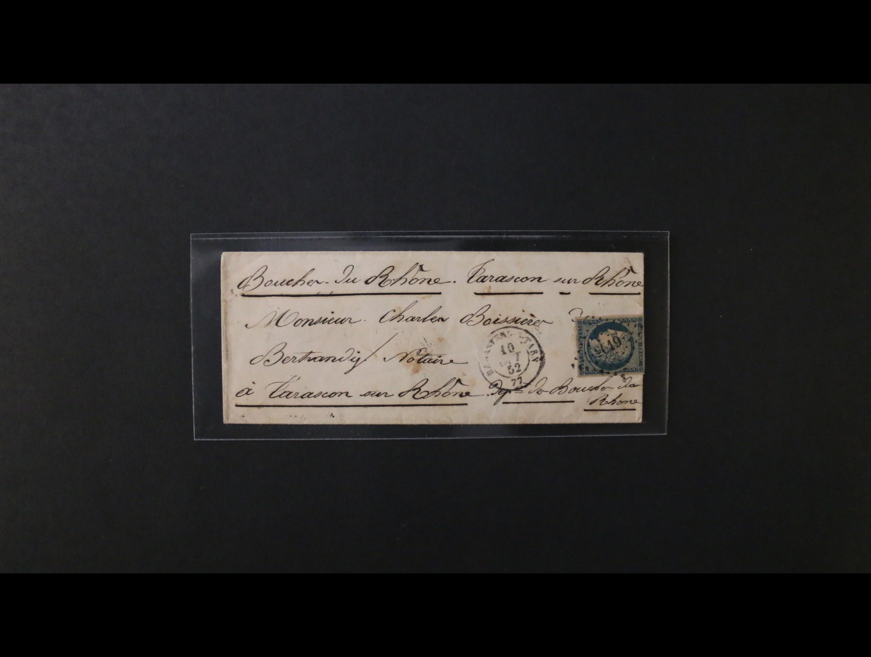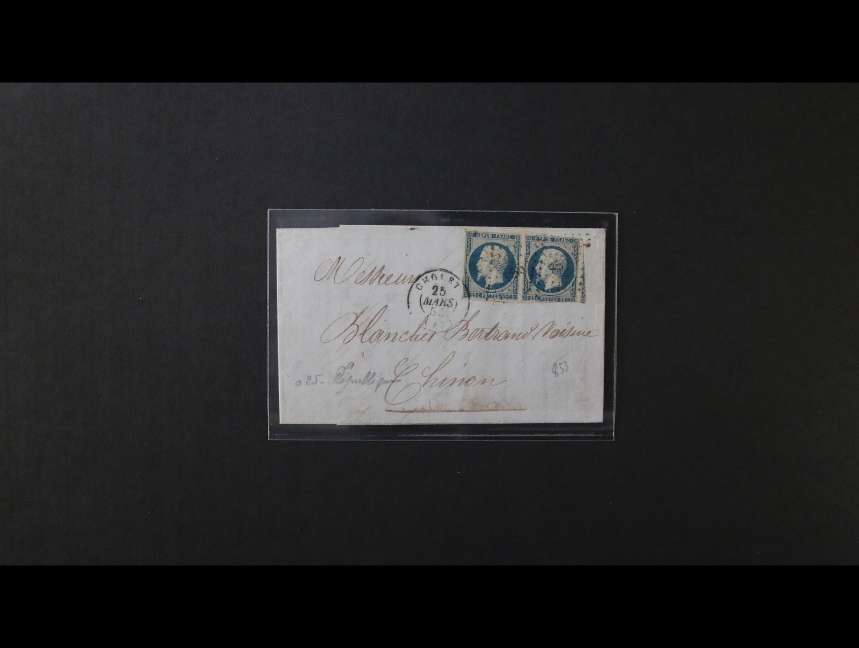 skl. dopis z r. 1854 frank. zn. Ma. č. 10 ve vodorovné dvoupásce, podací němé čís. raz. + denní raz. CHOLET 25.MARS.1854, průch. a přích. raz.