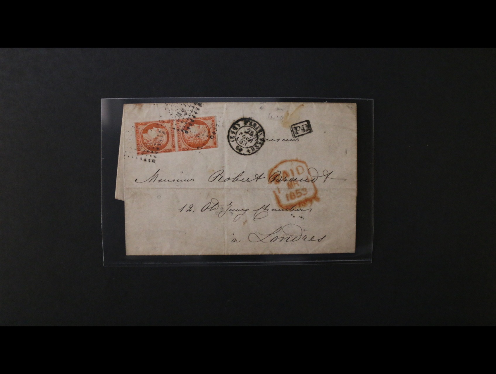 skl. dopis z r. 1853 frank. zn. Ma. č. 5 40c oranžová, podací němé čís. raz. + denní raz. PARIS 28.FEUR.1853, průch. a přích. raz.