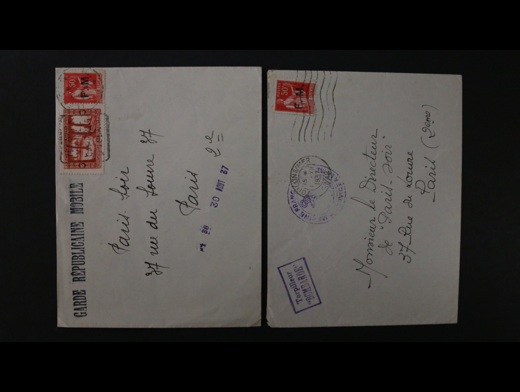 dopis do Paříže frank. zn. PP Mi. č. 6 dofrank. alžírskou zn., denní raz. + řádkové raz. GARDE REPUBLICAINE MOBILE a datumovkou 30.AOUT.37 a dopis do Paříže frank. zn. FM Mi. č. 6 s pod. raz. COULONSIMER 15.12.37 + příd. rámeč. raz. TROPILLEUR "BOMBARDE" a kulatým fialovým lodním raz.
