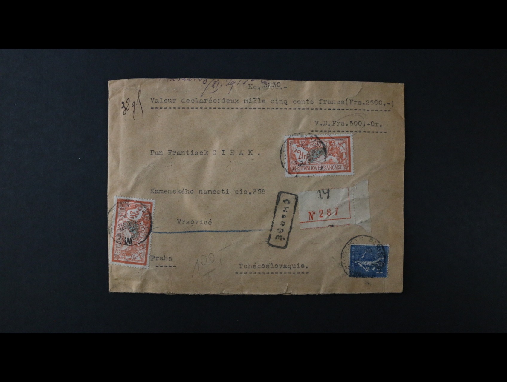cenné psaní do ČSR na 3230K frank. na přední str. zn. Mi. č. 168 a 99 (2x), na zadní str. zn. Mi. č. 99, 168, 235, pod. raz. PARIS 12.OCT.1929, neporušené pečetě, přích. raz.