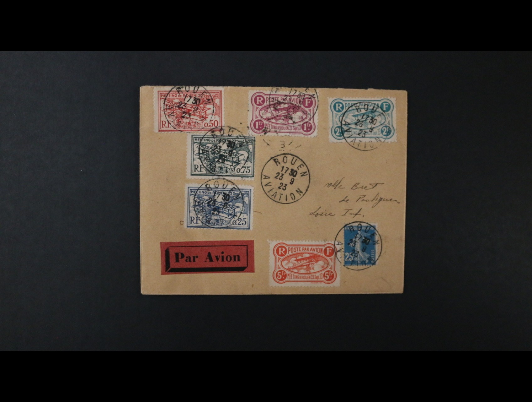 let. dopis frank. zn. 20c Rozsévačka s vylepenými let. nálepkami, pod. raz. ROUEN 23.9.23 AVIATION, zajímavé
