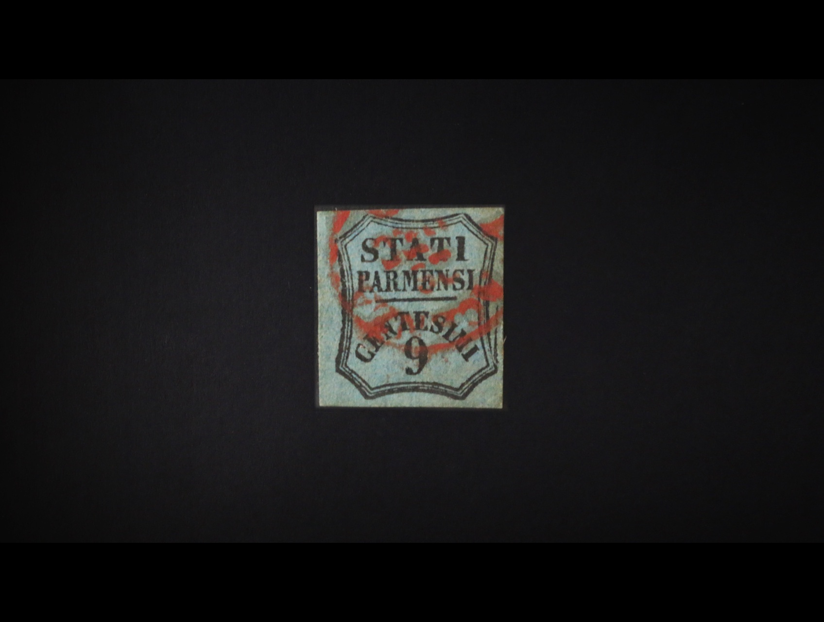 1000 Staroitalské státy – Parma 1853, Novinová Sass.2 9C modrá, červené raz. VICENZA 23 DEZ, kat. 1000 EUR 13000
