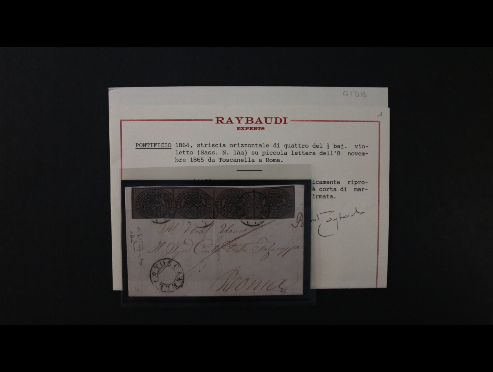 985 Staroitalské státy - Církevní stát - skl. dopis malého formátu z r. 1865 do Říma frank. vodorovnou čtyřpáskou zn. Sass. 1 Aa, atest Raybaudi, lux. kvalita, kat. cena 8400 EUR 45000