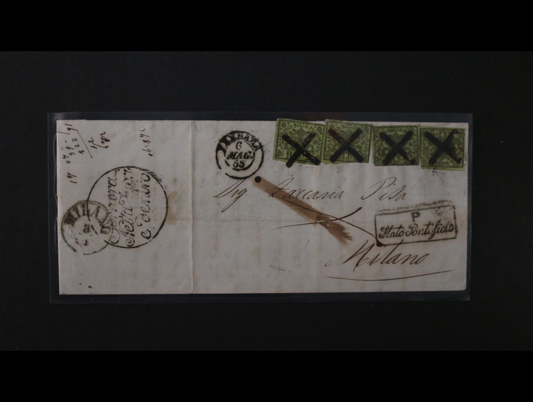 987 Staroitalské státy – Církevní stát – CHOLEROVÝ DOPIS z Ferrary do Milana, s 4 x Sass. 3b 2Baj zelená „oleoso“, raz. „Ferrarský kříž“ Ferrara 6 Mag. 55 a cholerové FERRARA NETTA FUORI E DENTRO, příchozí Milano 8/3, vzácný 3000