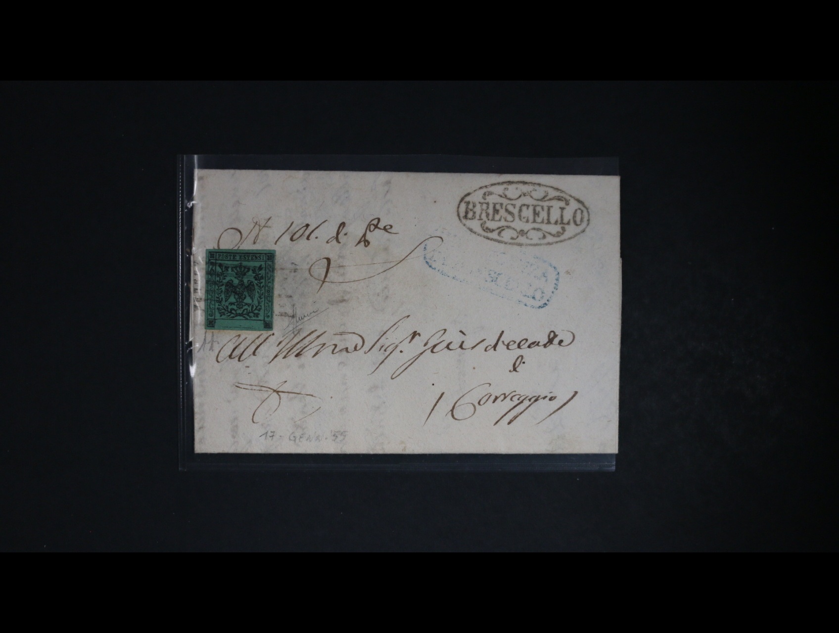 991 Staroitalské státy - Modena - malý skl. dopis z r. 1855 frank. chybotiskem zn. 5c (bez hodnotového označení), kat. Sass. č. 7 M (Mi. č. 1), zk. Sorani, kat. cena 13750 EUR 49000