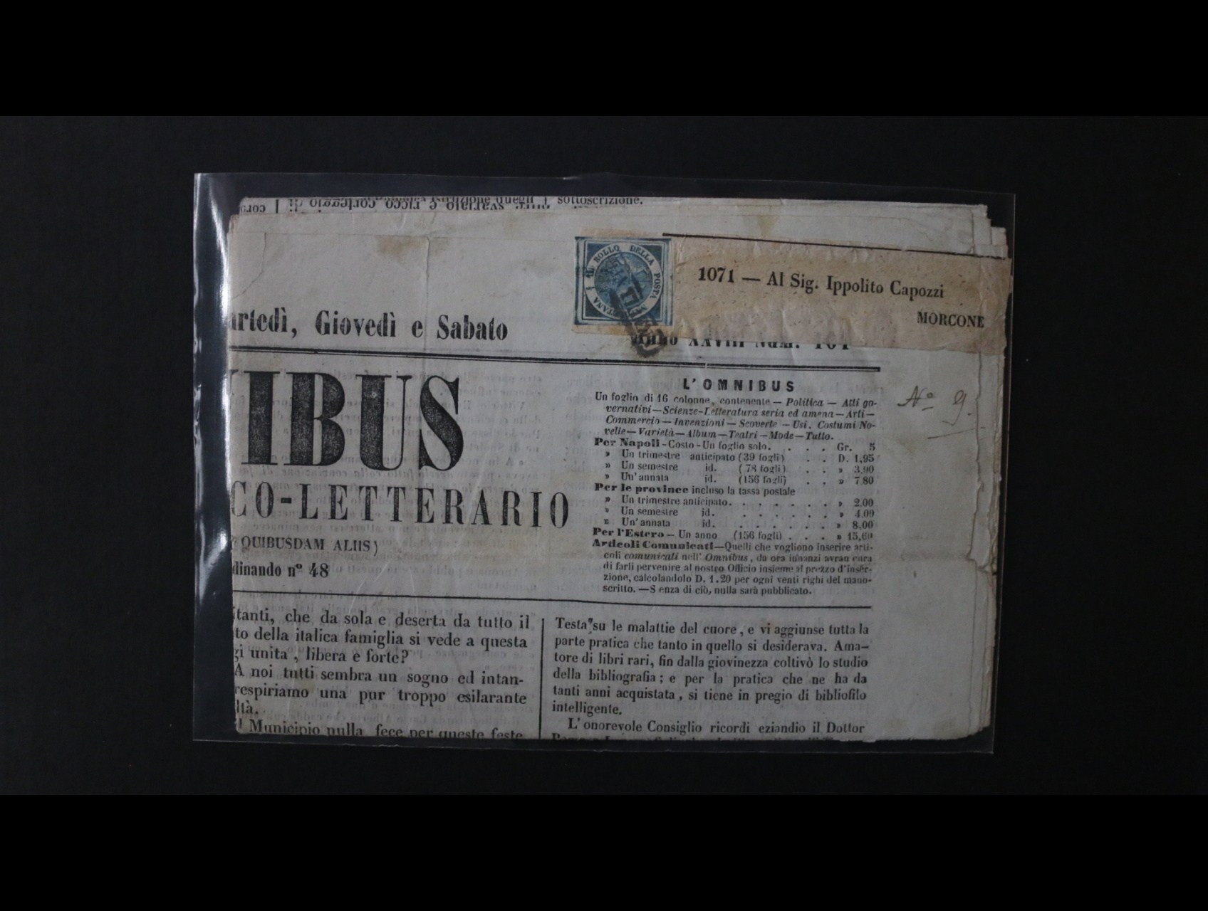 992 Staroitalské státy - Neapol - celé noviny L OMNIBUS z 8.Novembra 1860 (třetí den po vydání zn.) s kompl. adresním štítkem, frank. zn. 1/2Tornes modrá Sass.č. 15 , lux. střih, široké okraje, s rámeč. raz. ANNULATO, jedná se o jednu z největších evropských rarit, atest Martin Eichele Švýcarsko, kat. cena 50000 EUR +++ 390000