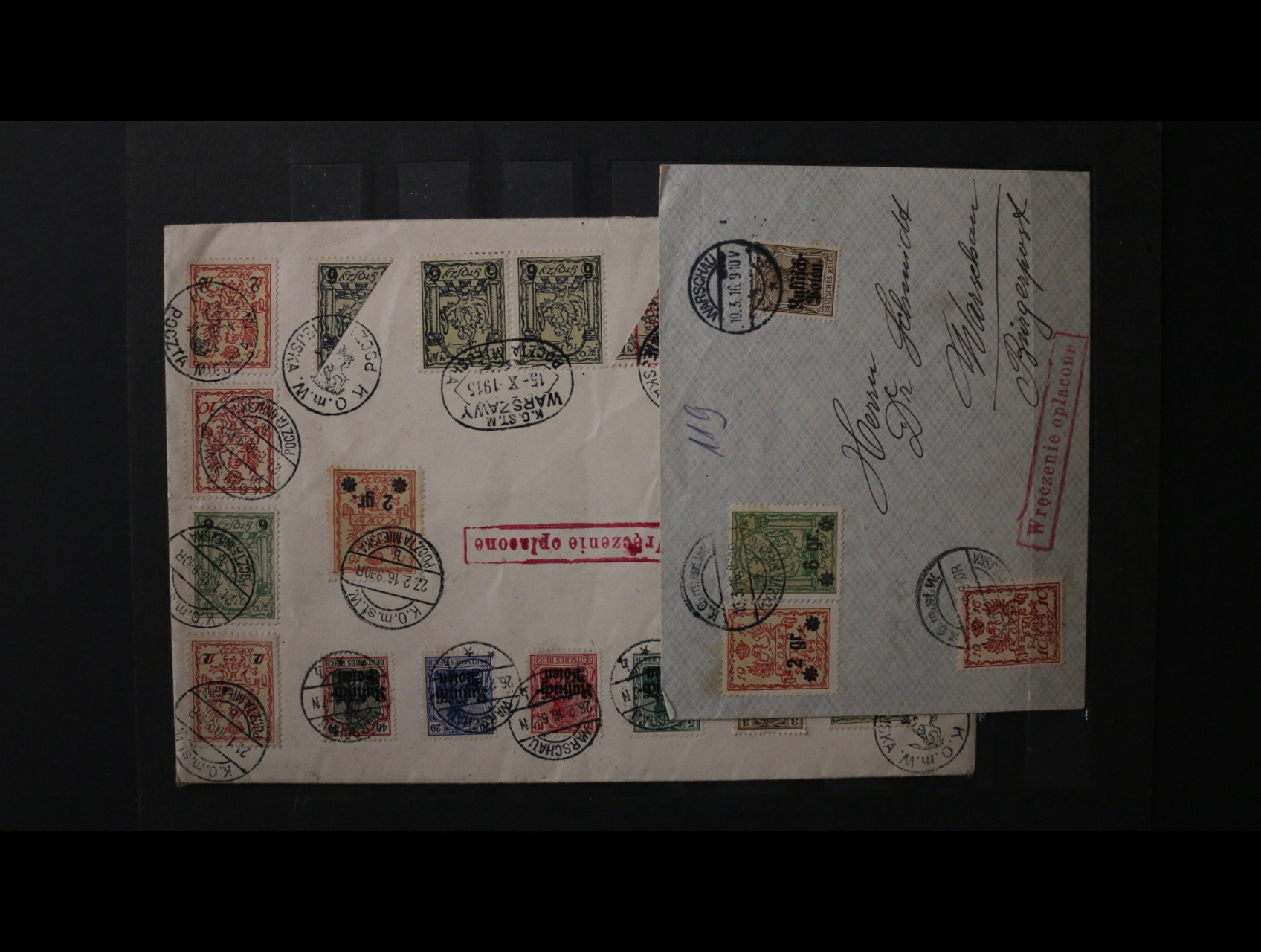 Polsko - dopis frank. zn. Mi. č. 1 s pod. raz. WARSCHAU 10.3.16, dofrank. zn. lokální pošty č. I + 9, 10 s raz. K.O. m. st. W POCZTA MIEJSKA + rámeč. raz., obálka velkého formátu se zn. Mi. č. 1 - 5 + známkami lokálního vydání vč. zn. půlených s denním raz. WARSCHAU 26.2.16, raz. městské pošty a oválným raz. K.C.ST.M. WARSZAWY 15.10.15, zajímavé, k prohlédnutí