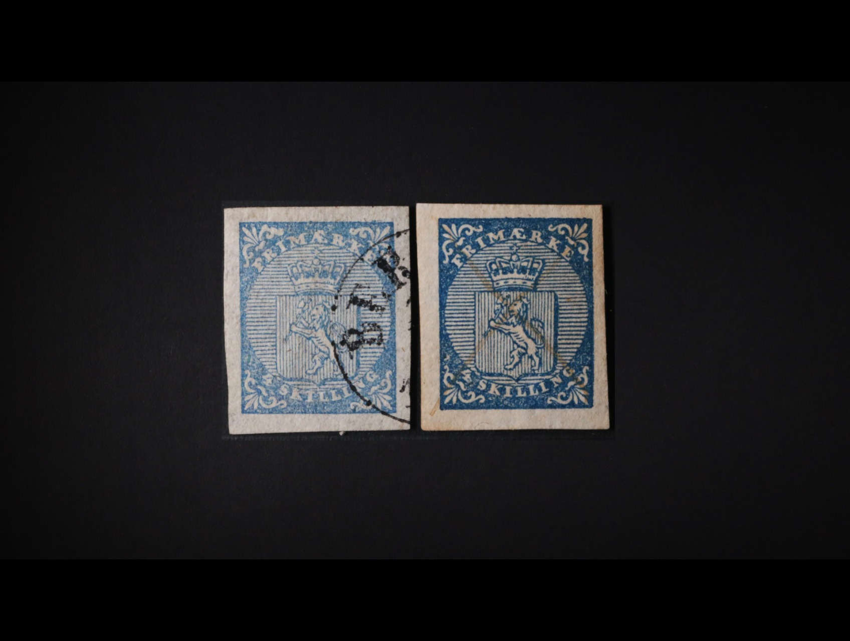 1855, zn. Mi. č. 1 2 x Znak 4 Skilling; světle ultramarínová (vzácná barva) a modrá, s ojedinělým typem znehodnocení – denní razítko a ruční škrt; luxusní střihy
