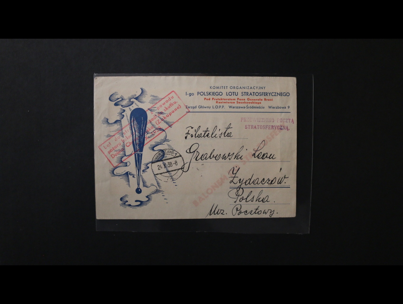 balonová pošta - oficielní KL k balonovému letu frank. Bl. Mi. 6 "Stratosferický let", pod. raz. ZAKOPANE 24.9.38, červený rámečkový let. kašet, průch. a přích. raz., zajímavé