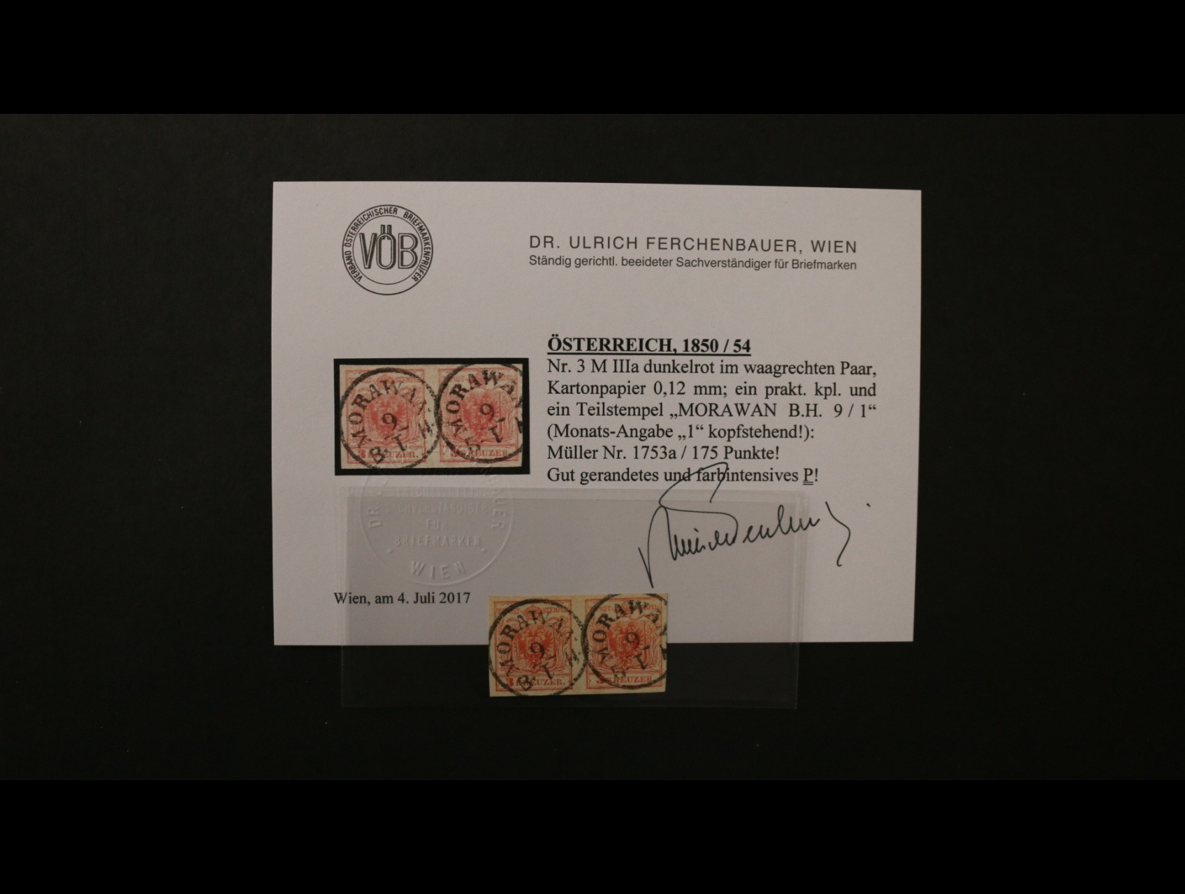 zn. Fe. č. 3 MP, typ IIIa Kartonpapier 012mm ve vodorovné dvoupásce s raz. MORAWAN B.H. 9.1.1. s převrácenou jedničkou, kat. Müll. 175 bodů, ates Ferchenbauer, lux. kvalita