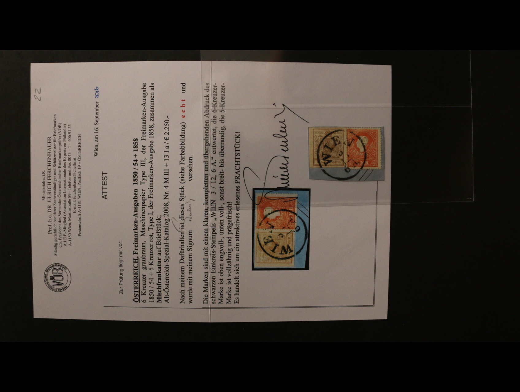 výstřižek frank. zn. Fe. č. 4 M, typ III + 13 I (6kr+5kr) I. typ raz. WIEN 3/12, mimořádně kvalitní exemplář, atest Ferchenbauer, kat. 2250 EUR